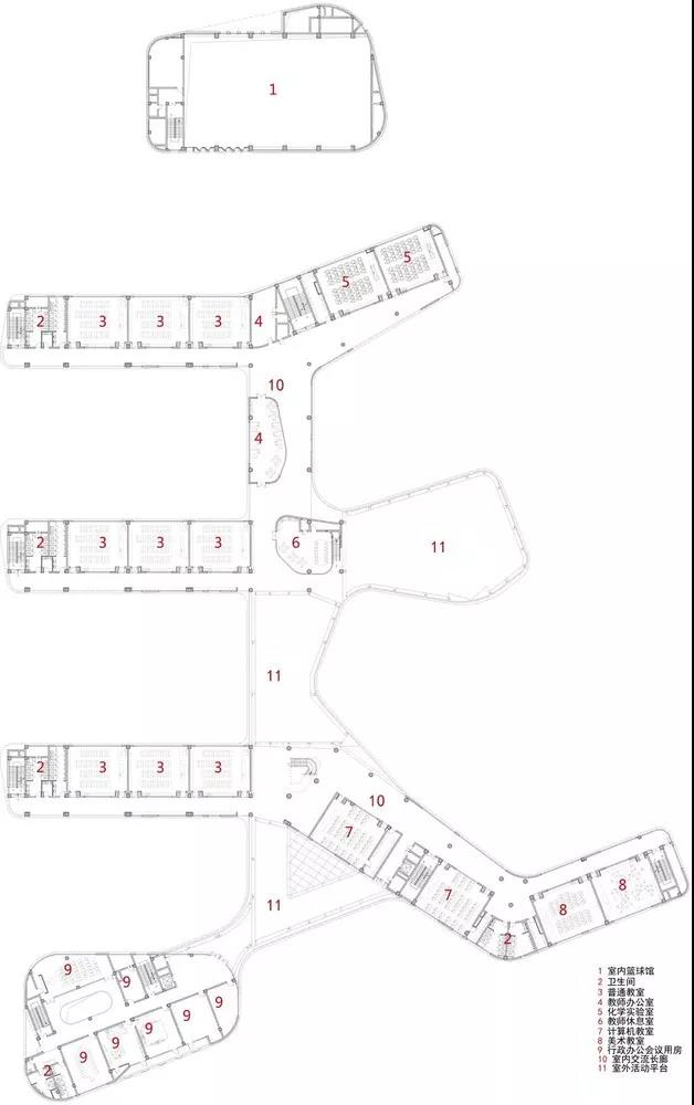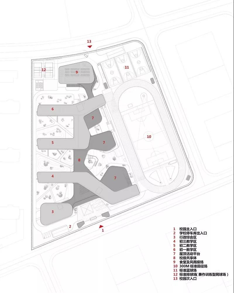 食堂、風(fēng)雨操場(chǎng)、教師辦公等輔助活動(dòng)空間的公共性最強(qiáng),布置在校園南北兩端,交通便利并為核心教學(xué)區(qū)起到盾牌的作用。