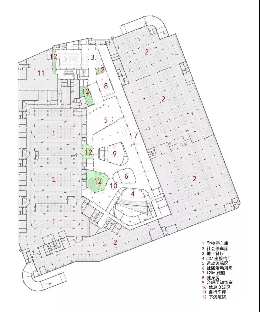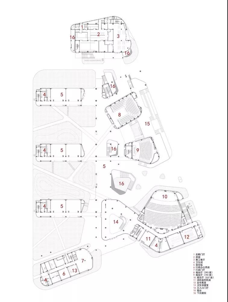 沿東側(cè)運(yùn)動(dòng)場(chǎng)穿插的三個(gè)報(bào)告廳