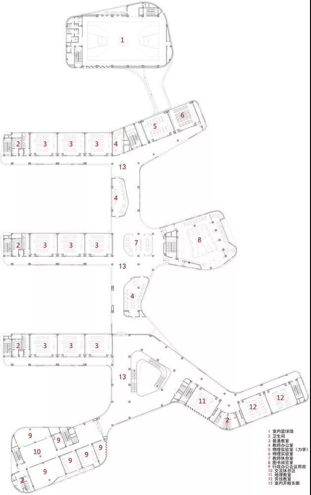 普通教室作為校園建筑中最基本的教學(xué)單元,是學(xué)生日常停留最久、使用最頻繁的空間。被置于校園內(nèi)部最安靜,交通最便捷的核心活力軸西側(cè)。專(zhuān)業(yè)教室、圖書(shū)室、報(bào)告廳等教學(xué)輔助用房,置于活力軸東側(cè),保持與普通教室的緊密聯(lián)系,而這些連接部位是設(shè)置個(gè)人或小組非正式學(xué)習(xí)的最佳場(chǎng)所。