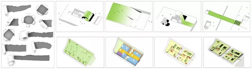 洞穴劇場是由辦公體塊搭接而成的核心空間, 周邊設置各個環繞的視點,自然地吸引了員工的聚集活動。私家庭院和陽臺種植郁郁蔥蔥,與周邊的空間形成戲劇性的視線交流。細高而狹窄的通道既有冷巷的功能,又形成城中村式的親切感。這些空間大小錯落,四通八達, 內外交融,和北綠廊社區的空間肌理自然融合,形成豐富的游走體驗,充滿了轉過街角的偶遇。為入住的創意設計公司群落提供富有想象力的辦公環境。