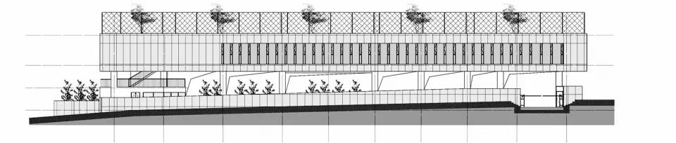 本車庫不再是隱蔽的后勤設施,而成為一個獨特的亮點。通過簡潔的玻璃幕墻,讓內部車廳的機械部件和車輛的往復運動從外部得以感知,形成自然的展示效果。車庫地面的下沉和隆起, 將公園變形成為立體綠化空間。陽光和空氣引入下沉庭院,坡道緩緩的向上延伸到10米高的觀景臺,并與貫穿綠廊的空中漫步道無縫連接,使車庫融入公園立體景觀。