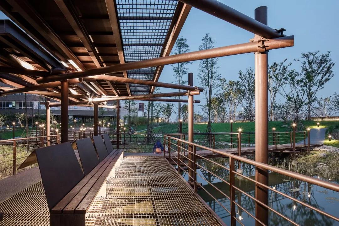 另外通過設置水泵和灌溉系統(tǒng),濕地中匯集的水還可用于整個景觀場地的澆灌之用。而植物配植以原生草本植物和耐水喬木池杉為主,同時配以輕介入的鋼結構景觀構筑物,形成別具原生野趣和工業(yè)特色的景觀環(huán)境。