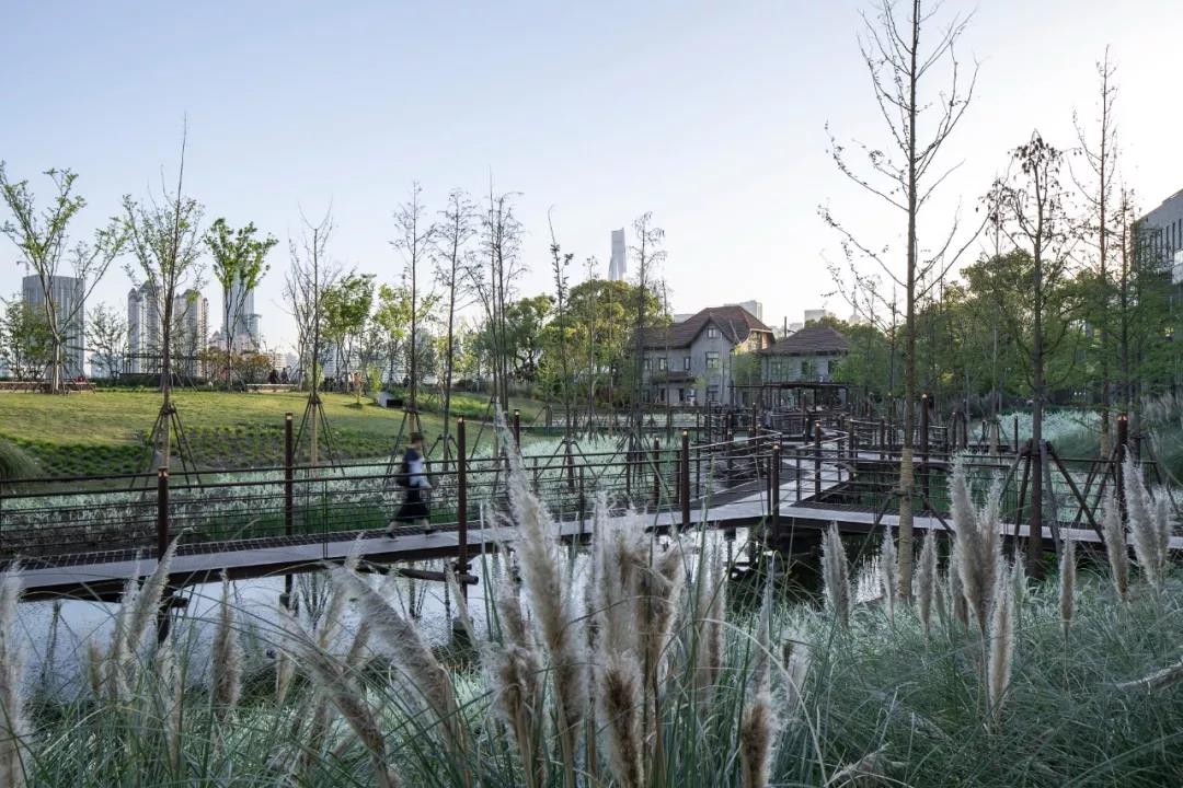 采用有限介入、低沖擊開發(fā)的策略,在尊重原有廠區(qū)空間基礎和原生形態(tài)的基礎上進行生態(tài)修復改造。在防汛墻后腹地較大區(qū)域原本是一片低洼積水區(qū),水生植物叢生,我們保留了原本的地貌狀態(tài),形成可以匯集雨水的低洼濕地。大雨時能起到調(diào)蓄降水、滯緩雨水排入市政管網(wǎng)的作用。