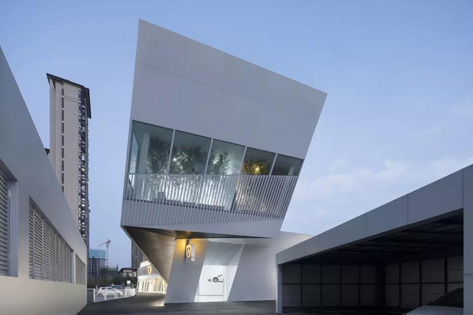 建筑師從蘭博基尼超跑硬朗的線條和激昂的棱角出發,將場地限制轉化為優勢,利用平行四邊形和三角形語言創造了一個適應于場地的全新建筑。建筑利用一系列旋轉上升的連續表皮圍合出整個建筑空間,連續的開窗使得來訪者在建筑的內部隨時可以與室外進行對話,來訪者在建筑中行走就像駕駛著一架特別的“超級跑車”,可以隨時關注內部空間和外部景觀的變化。為了消解體量壓迫感,建筑師設計并沒有將兩層體量滿鋪來與環境抗衡或是被動的避讓周邊建筑,而是通過兩層之間的錯動在通道的基礎上在和北側建筑之間創造了一個視線通廊,優雅的提醒到訪者新建筑的存在。