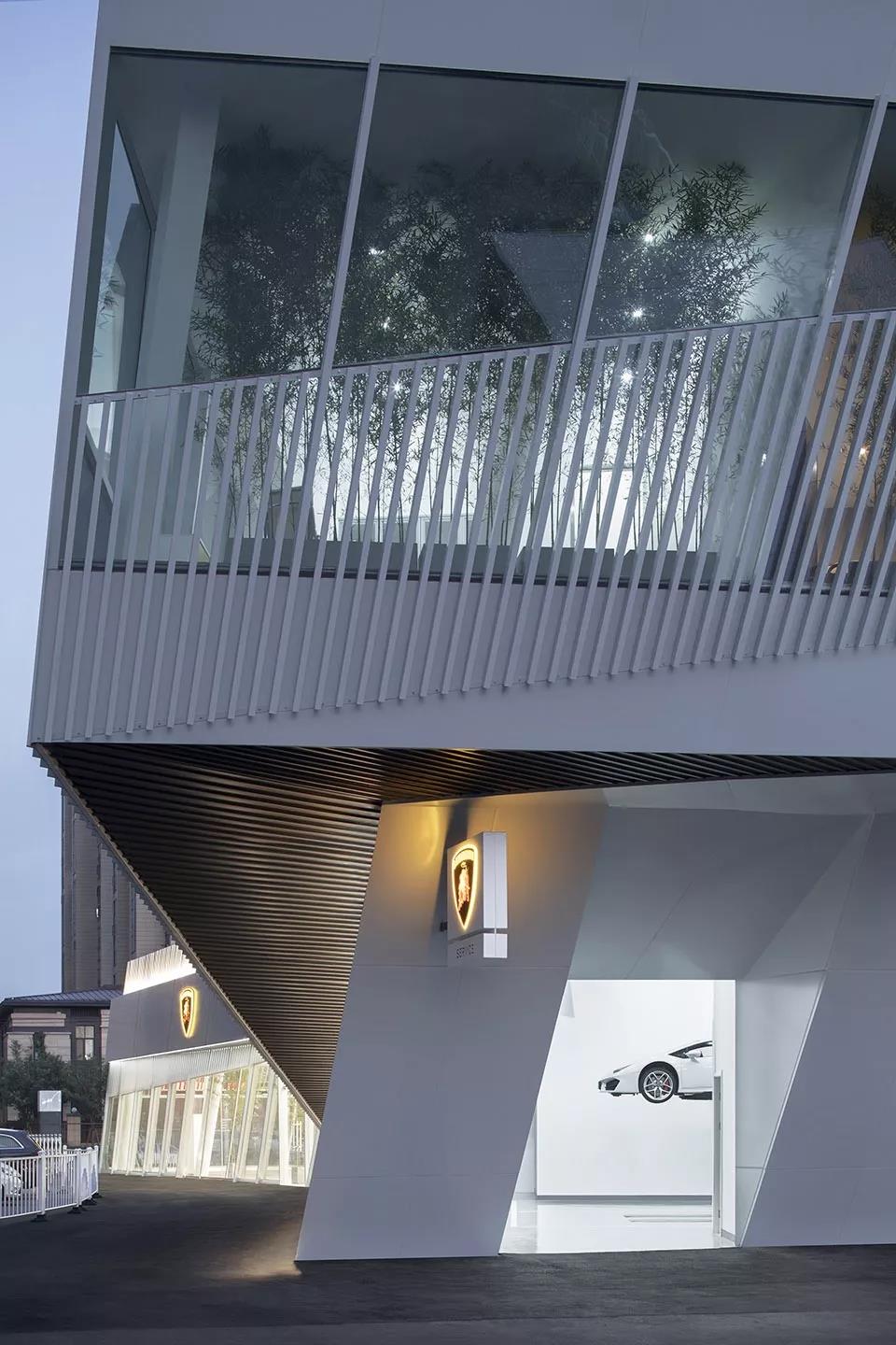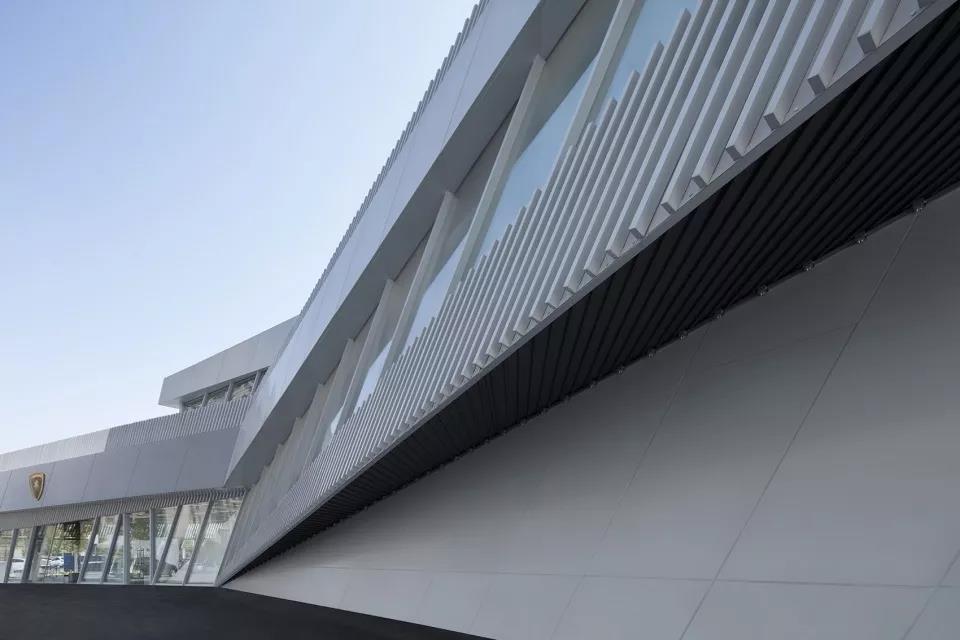 其設計靈感來源于蘭博基尼經典車型的造型迭代,整個建筑利用與場地約60度的傾斜角造型呈現強烈的動勢,并通過形體的扭轉營造出的空間變化。設計與環境充分呼應,為場地注入了新的活力,形成了一個全新的地標。
