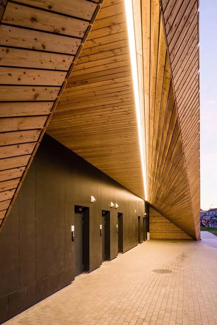 ▼水平排列的天然西伯利亞落葉松板增強(qiáng)了體量的動(dòng)態(tài)效果