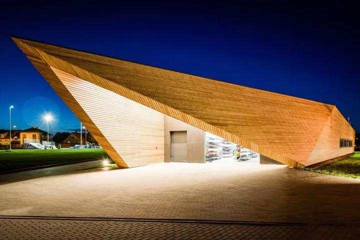水上運(yùn)動(dòng)中心包括兩個(gè)設(shè)施:皮劃艇基地和帶有平臺(tái)的船庫(kù)。 皮劃艇基地建筑是單層的,看起來(lái)像一個(gè)三角形。平屋頂在縱向方位稍有傾斜,不同的高度對(duì)應(yīng)著相應(yīng)的功能區(qū):倉(cāng)庫(kù)和工作室部分較高,其余部分較低。建筑的總體造型與運(yùn)動(dòng)和動(dòng)力有關(guān),傾斜的墻壁創(chuàng)造了獨(dú)特的拱廊,突出了入口、塑造了景觀(guān),也讓建筑的視覺(jué)效果隨著人的觀(guān)看方位而變化。
