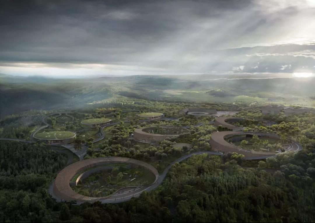 得益于成都平原得天獨厚的自然環境啟發,EID Architecture提出以環境友善及熊貓友善為出發點,融合建筑與自然的和諧共生。設計依托山地地貌順勢而為,勾勒出最原初的幾何圓形,將熊貓及其生存的自然環境懷抱于建筑與景觀之中。