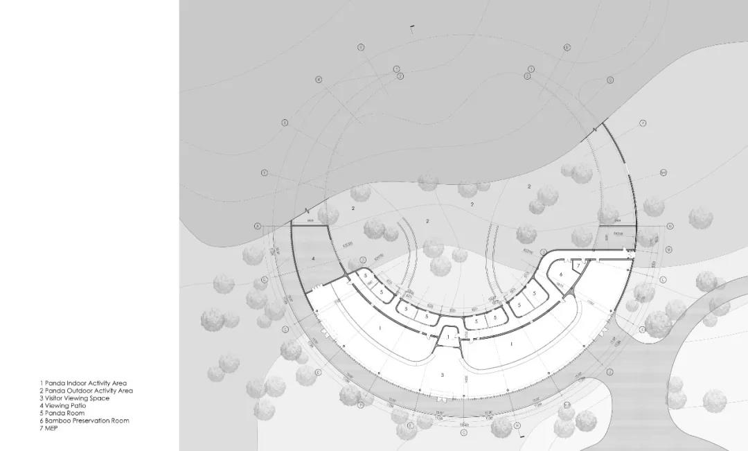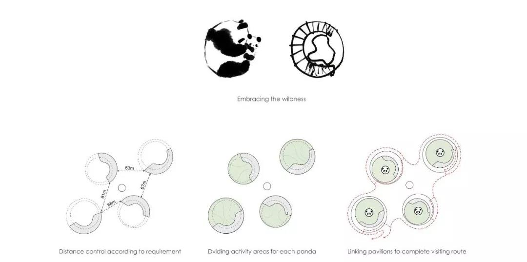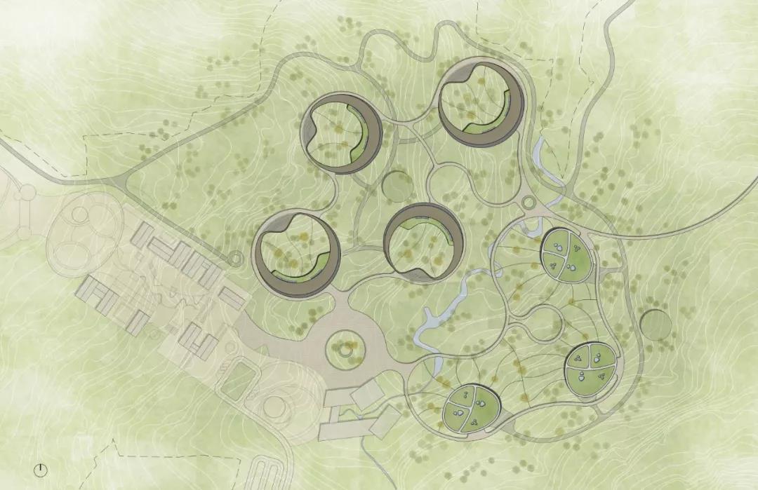 熊貓新舍作為大熊貓的養護中心,致力于促進跨學科的合作。新舍的設計圍繞四個適于觀察及參觀的圓形露天庭院進行組織布局,庭院主要用作大熊貓的戶外活動場所,創造其與自然的密切聯系。建筑以環抱自然的方式圍合了室外活動場地,隨著地勢的高低起伏和水系的蜿蜒變化,為熊貓和訪客提供了豐富的自然場景體驗。
