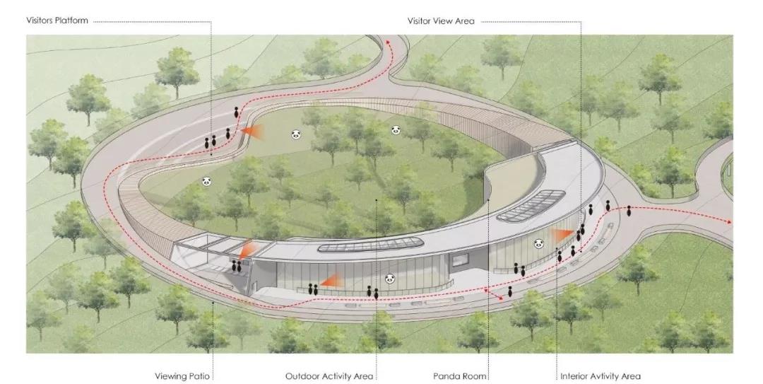 坐落于原生態自然場景之中的熊貓新舍將成為大地藝術的一部分,功能涵蓋室內展示區,熊貓獸舍,后勤區,以及室外活動展示區,為游客帶來沉浸式的探索和發現體驗。