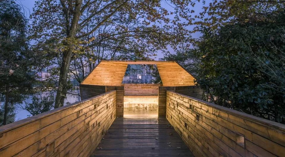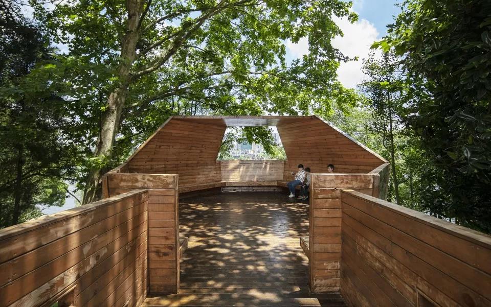 觀景臺藏在一片現狀樹林中,是南向觀湖的最佳視點,郁郁蔥蔥,一片幽靜,新植的桂花和雞爪槭協調新舊元素,填補了群落中層。