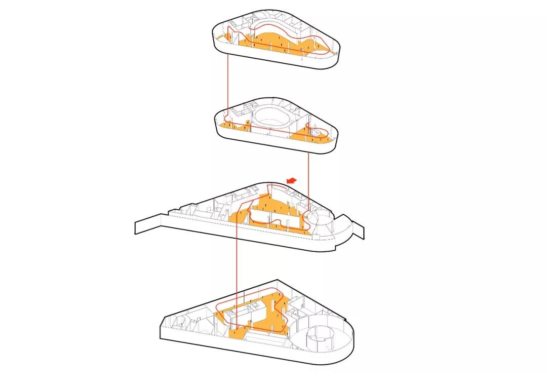 設計首先將場館2/3的體量置于地下,以平衡展廳高度要求、規劃限高和建設規模之間的沖突。并結合錢塘江游步道和項目地形的高差,區分了觀展入口流線和服務入口流線。其次,在杭州兩大濱水公共空間——運河游步道和濱江步行道交匯處建設博物館這一公共屬性強烈的城市場所的行為,激發了line+建筑師進一步強化其公共屬性的想法。