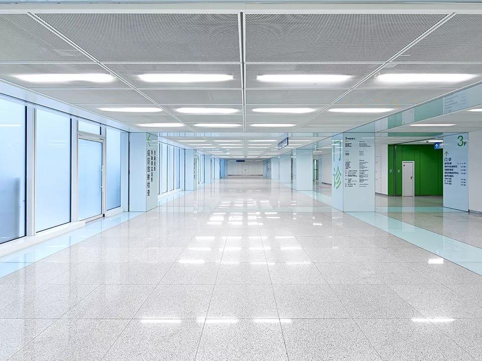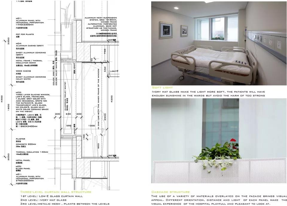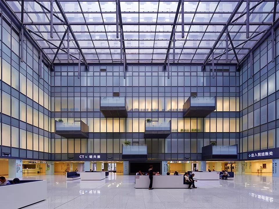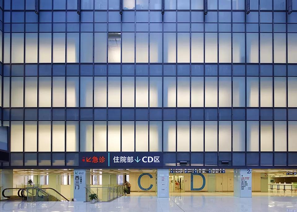 乳白色的磨砂玻璃,則在解決室內采光問題的同時將陽光過濾得更為柔和。針對南京地區夏季悶熱的氣候特點,立面設置側向的通風,有效帶走表皮積熱,大幅降低了能耗,成為名副其實的綠色節能醫院。