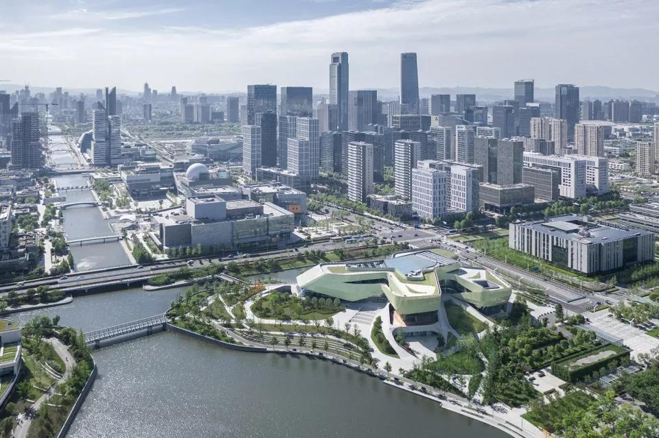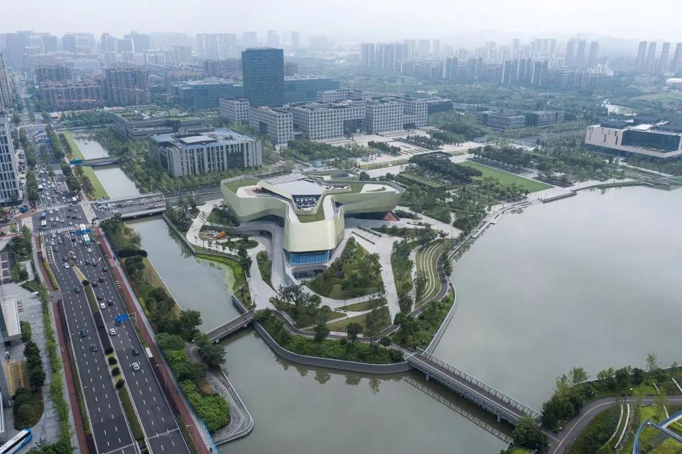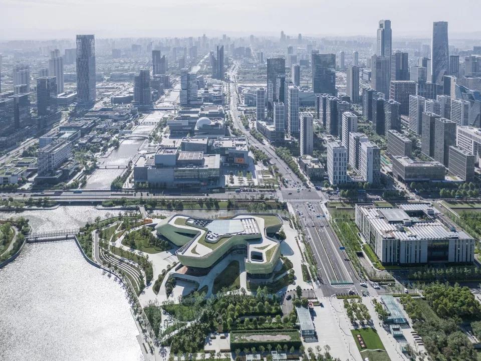▼展覽館鳥瞰圖,在城市新區內創造出一個引人入勝的公共空間