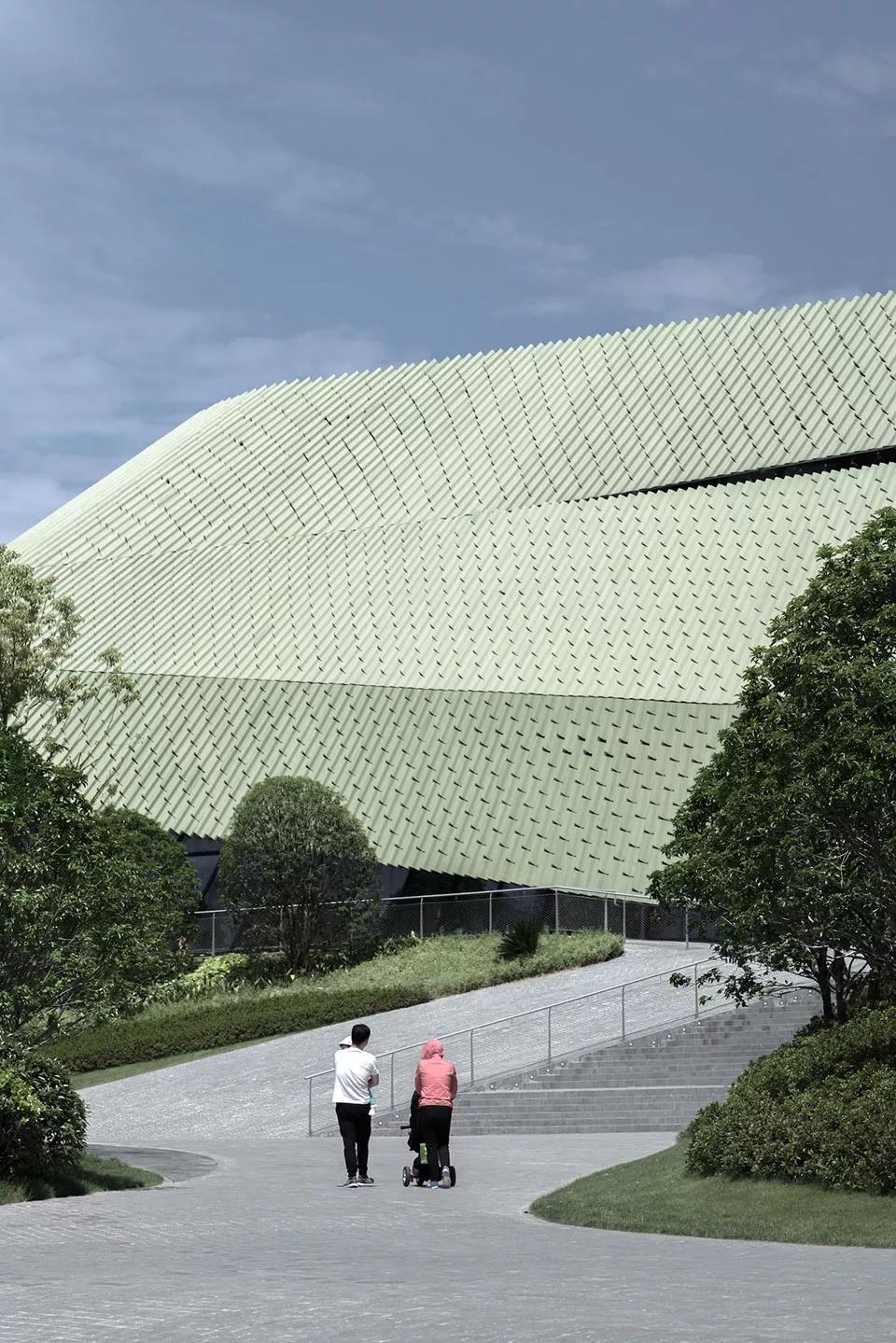 ▼展覽館外觀遠景,公園和建筑之間的界限變得模糊