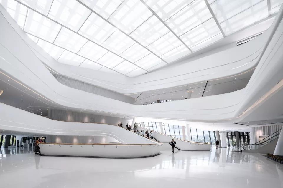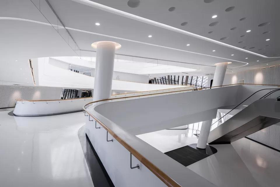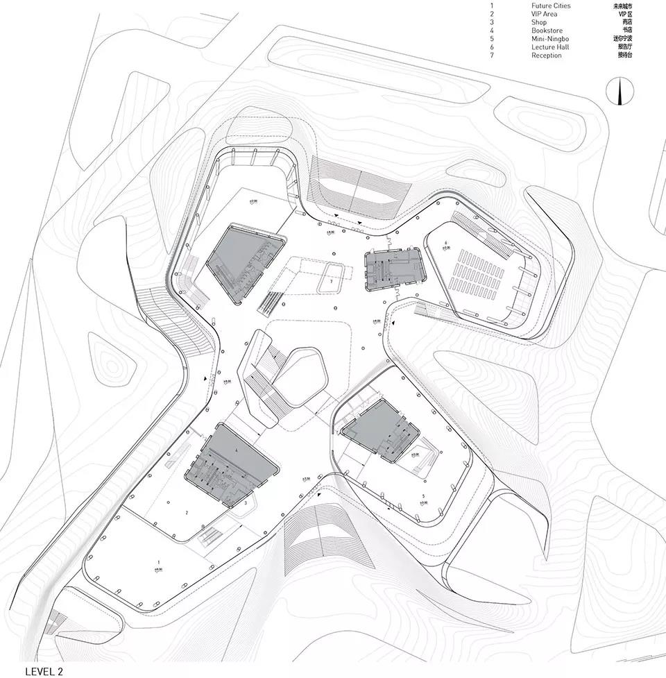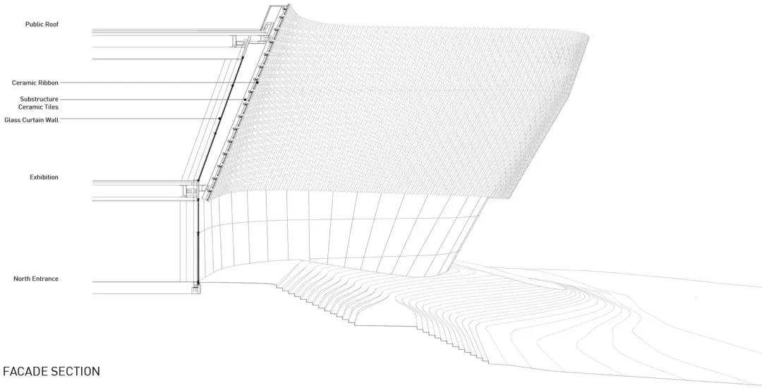 展館的二層設置著四個主入口,每個主入口都直接通向中央中庭。參觀流線從頂層開始,順著中庭周圍的坡道系統一路向下。值得一提的是,這個流線來源于空間序列的自然流動,并沒有明確的邊界,因而給人一種與室外景觀相似的自然連續感。參觀者如同居民在城市中生活一般地在展館中探索發現。他們可以自由地穿梭于室內外展覽空間、休息區和景觀平臺之間,在觀展的同時欣賞新建的城市環境。