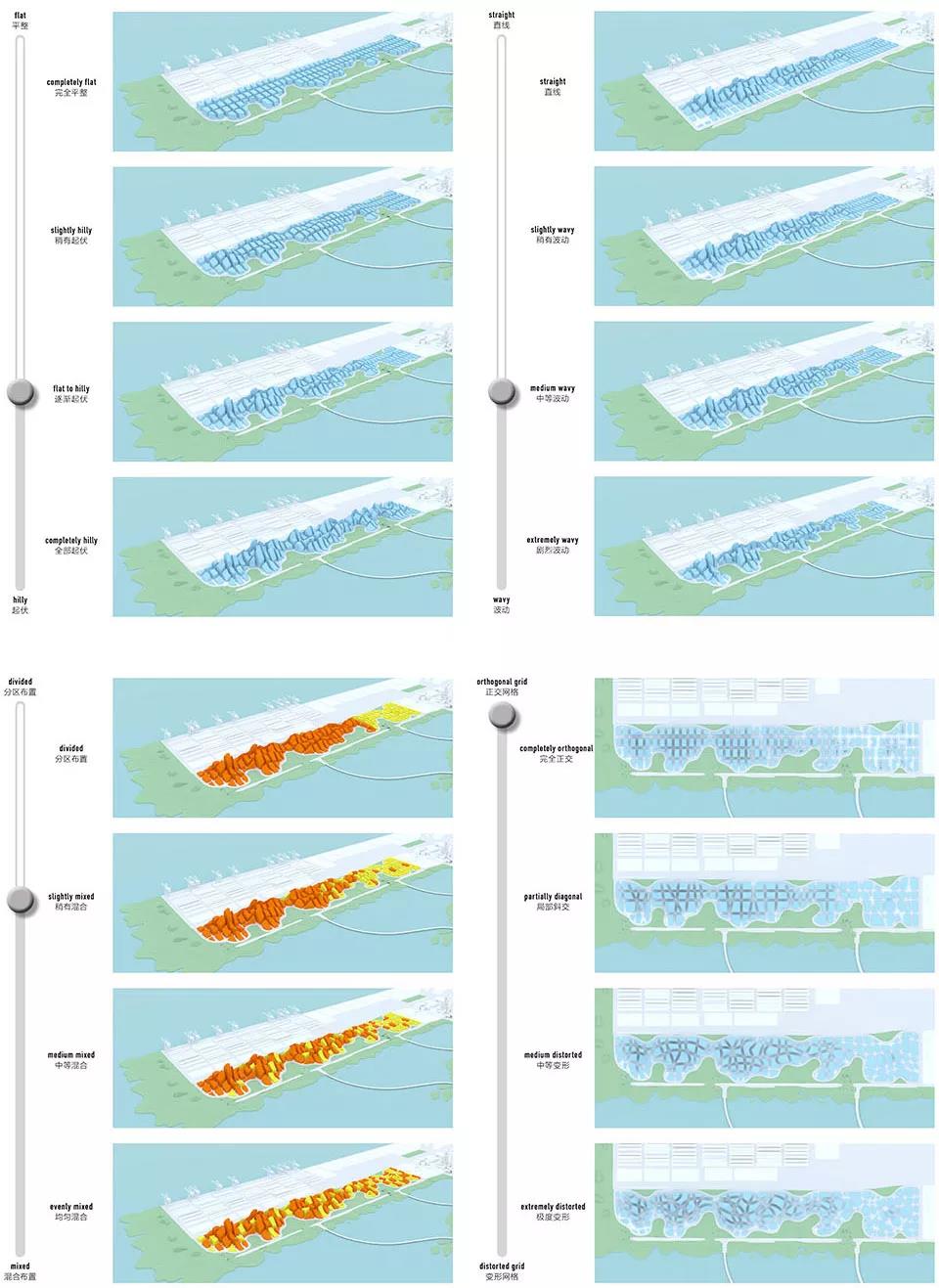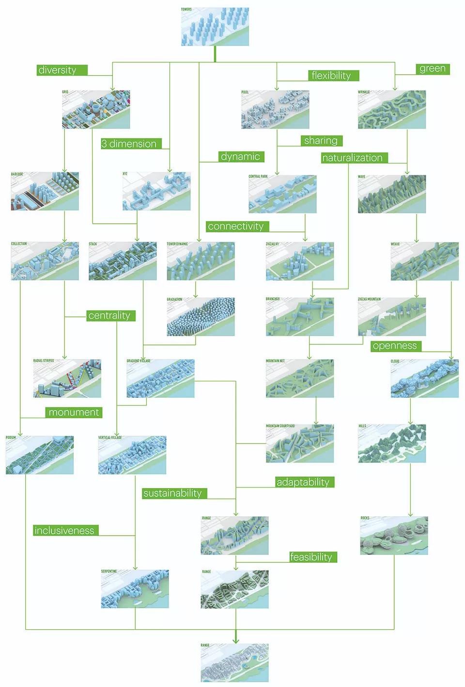 MVRDV在設計騰訊園區的同時,進行了針對性的深入研究,以期為現代化的科技園區提供最佳的設計方案。設計團隊為該項目開發了28種不同的總體規劃,并將它們排列成設計“譜系”。隨后從多元的角度依次評析,以求得個各方案中的精華,用來改善最初的概念。“每一個設計嘗試都被編錄,成為設計或維護未來智慧城市的新可能,”Winy Maas補充道:“最終的參賽作品綜合了所有設計嘗試中的經驗,呈現出一個多元,靈活,綠色,動態,開放,適應性強的前瞻性技術園區。