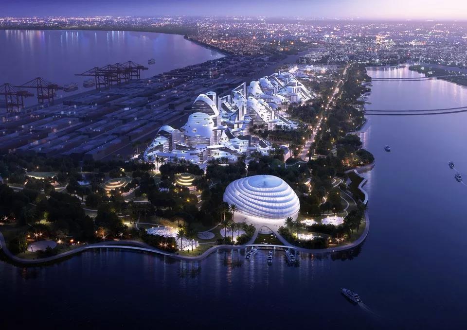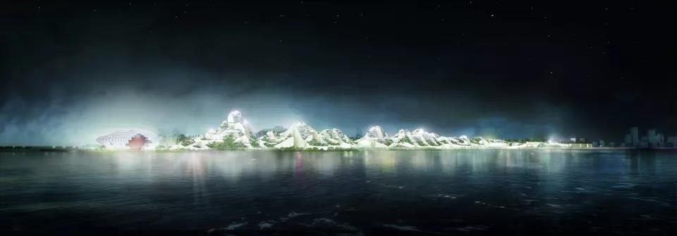 MVRDV的最終參賽方案呈現為由100幢建筑構成的綜合網絡,起伏的建筑屋頂采用光伏面板。建筑之間架橋連接,使園區整體形成連綿山脈的意向。園區東側,海濱公園環繞著建筑朝前海灣向外蜿蜒。公園延伸了相鄰建筑的底層面積,形成綠色空間。