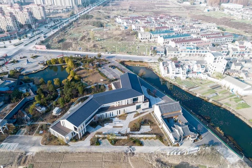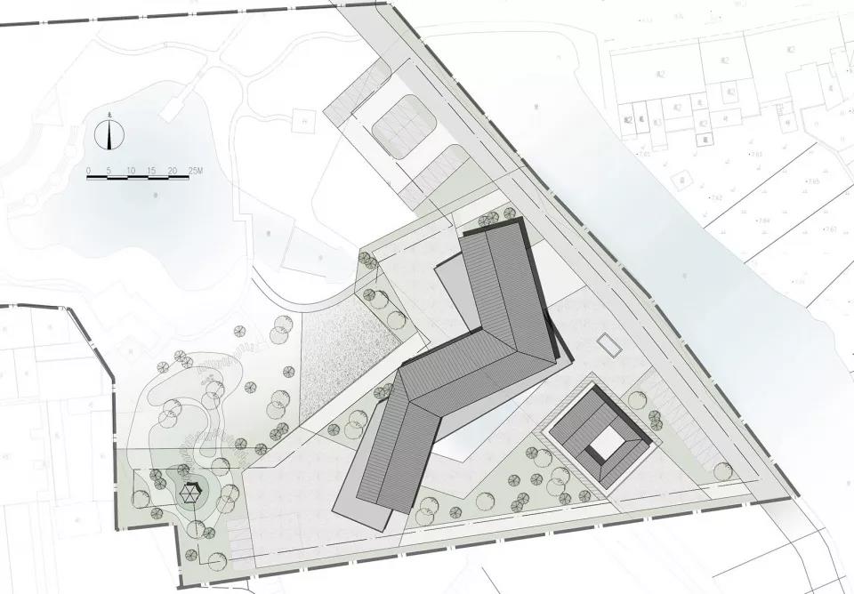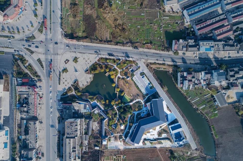 ▼主館東側鳥瞰,在建筑形態上提煉了“之”游動的形態,結合坡屋頂的特征