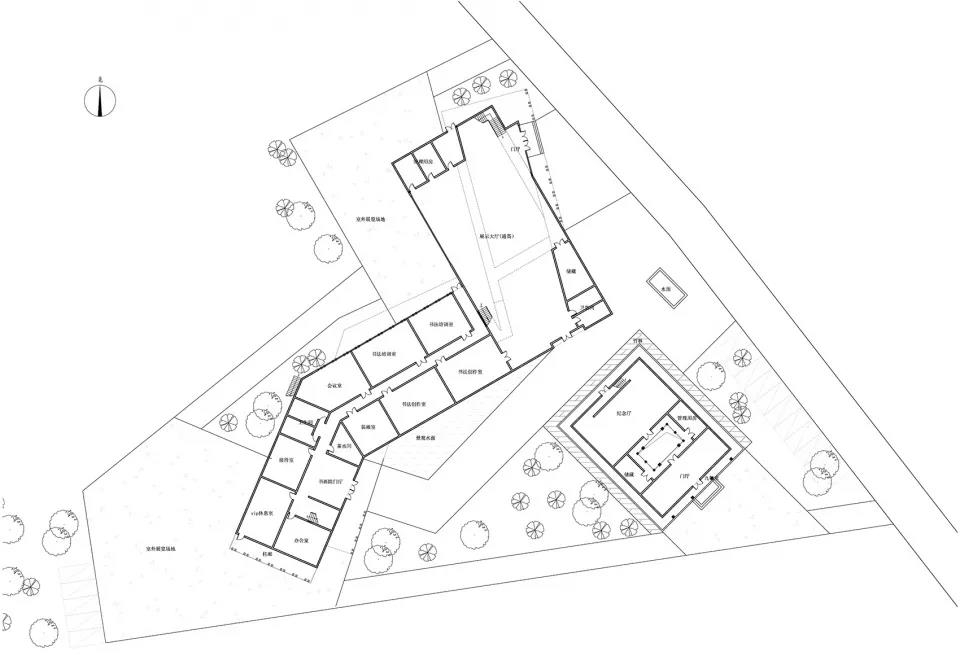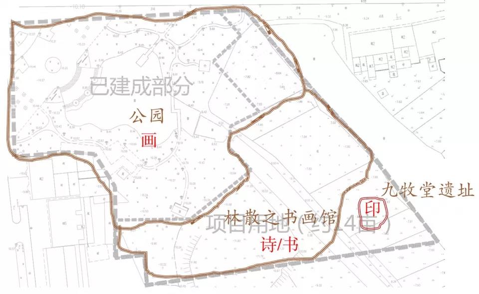 總體布局以中國傳統書畫為原型,提取詩、書、畫、印四個主要構成元素,將公園與廣場視作“畫”,以林散之書畫院作為“詩”,選取了其名字中的“之”為載體,用“書法”的形式表現出來,而方正的九牧堂又恰好可擬作“印”,同其他三個元素構成完整的一幅古典長卷。