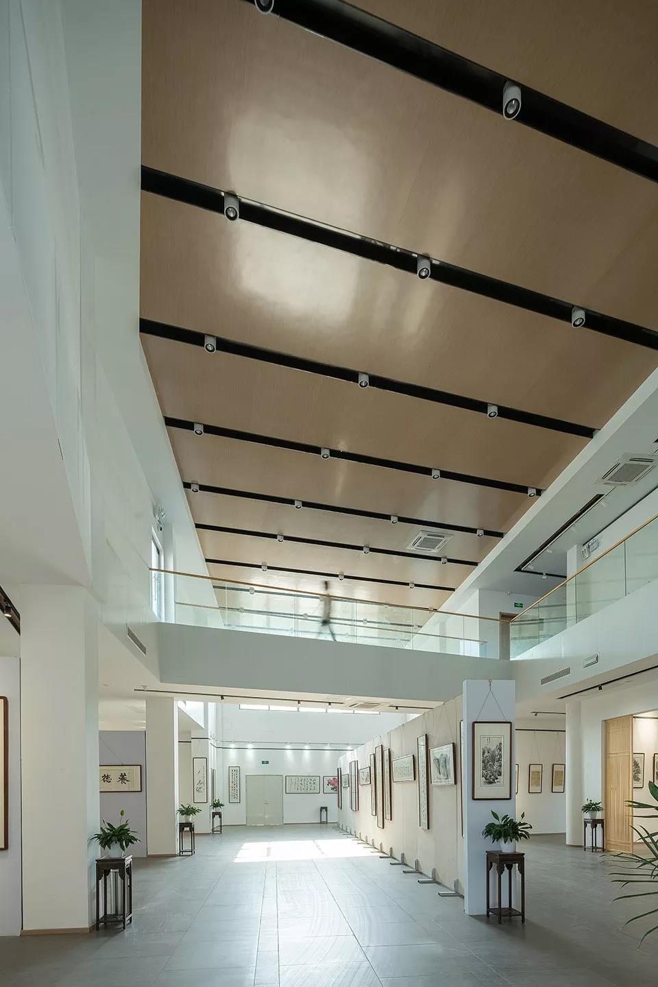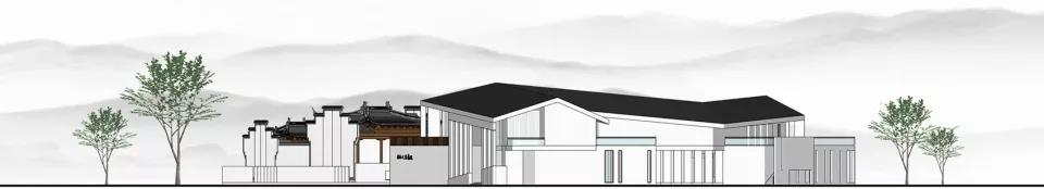 書畫院采用了白墻黑瓦的古樸材質,避免額外裝飾,僅用簡練的幾何體量創造空間,與傳統徽派的九牧堂既對比又呼應。建成之后的觀感也基本符合我們的預期,低緩的輪廓,交錯的形體,多變的空間效果,加上景觀綠植的襯托,曲直錯落,光影變幻,黑白起伏,遠觀就像一幅山水畫卷。