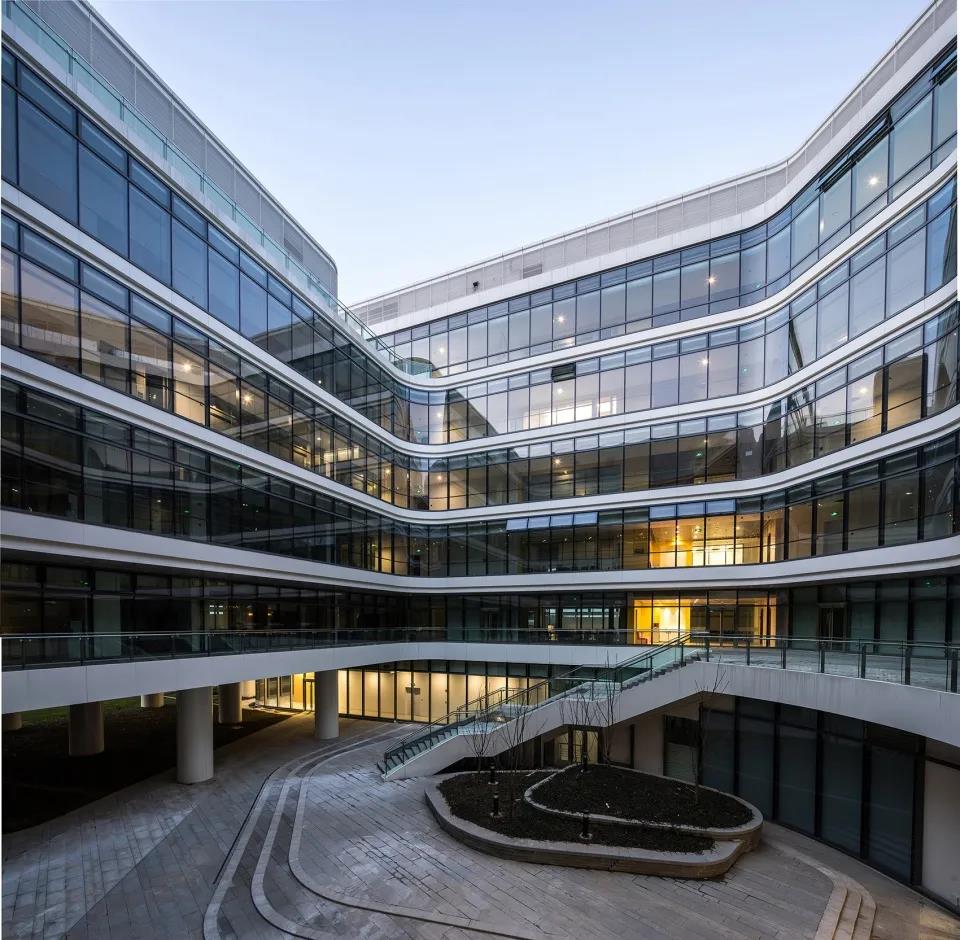 三幢研發建筑以“方中帶圓”的平面基本形態保證其使用效率和空間品質。每組“交通核”到達工位的距離不超過30m,研發辦公的進深不超過10m。為改善在南京相對濕熱條件下的“微氣候”,三幢建筑均植入了開放式的內院或有頂蓋的中庭,有效改善了室內自然采光與通風,因此被稱為“風之庭院”。其中五層通高的巨大陽光中庭成為共享與互動的重要場所。曲線樓梯盤旋上升,光影生動,活力十足。