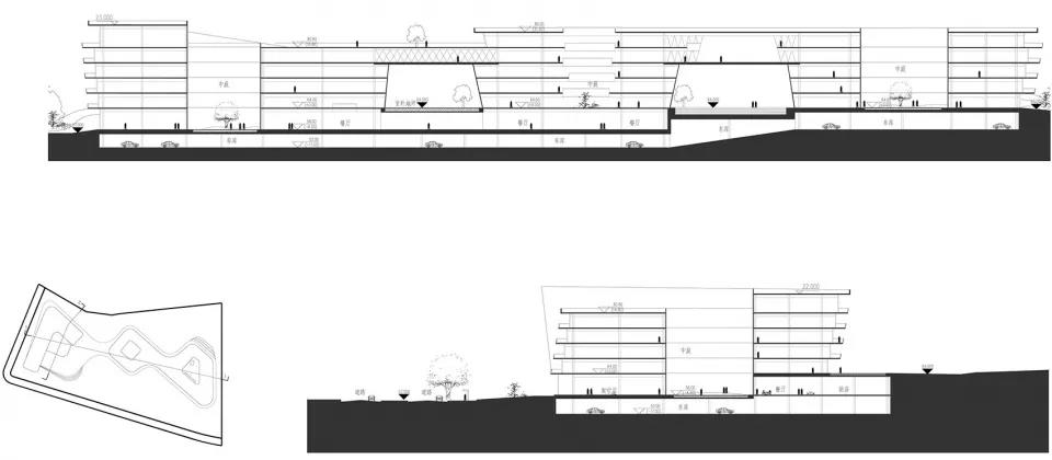 為了減少空間壓力,提供更好的景觀視廊,設計將7萬㎡的體量拆解成大小有別的三幢建筑,順應地形做了一定旋轉,減少主要界面的對視,贏得更多的觀景視野。將東西朝向扭轉成東南與西南朝向,在第五層的空中由二組30m巨大跨度的 “云廊”將三幢建筑連綴成一體。