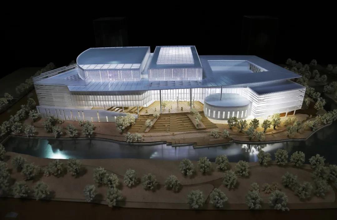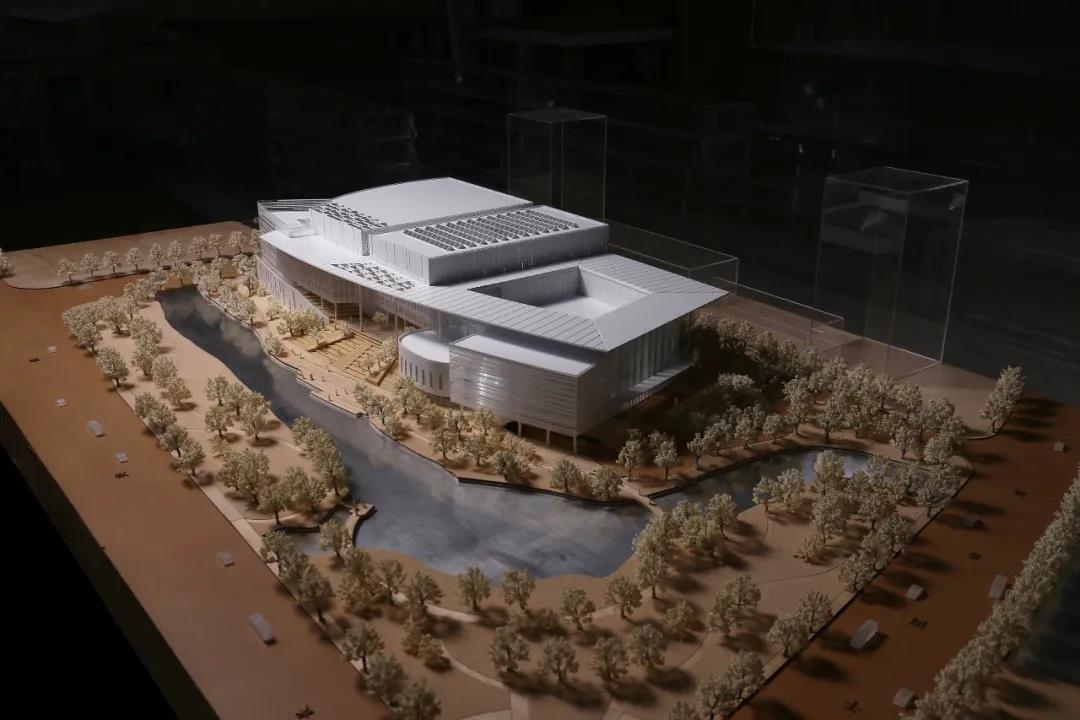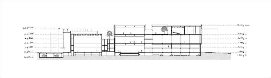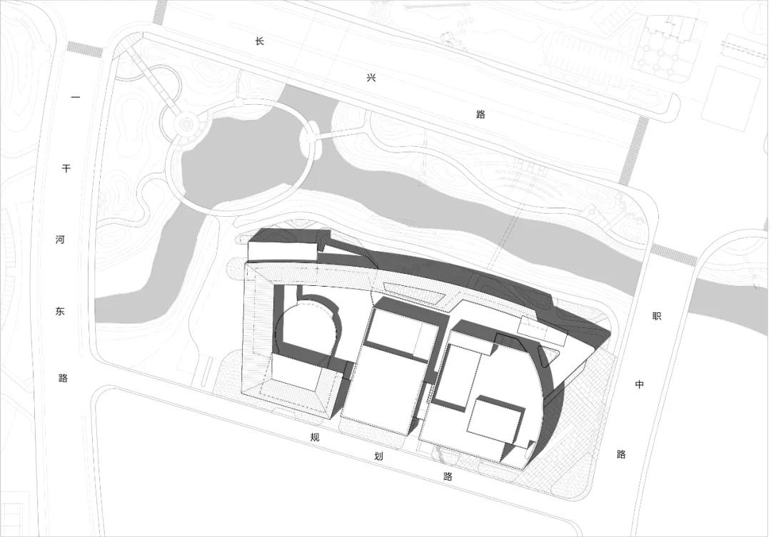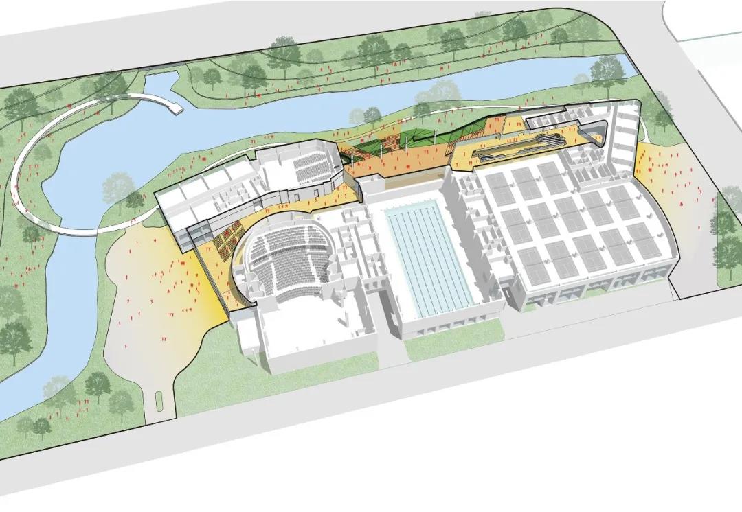 大臺階是劇院建筑的一個典型元素,在這里演繹成為閑坐、停留的場所,它開始于河岸,逐步爬升至二層平臺,將河道綠化帶入建筑內部。平臺繼續攀升至三層的花園,層層而上,綠茵蔥蔥。弧形大屋頂與彎曲的河道遙相呼應,頂部開設天窗,引入陽光,遮風避雨,提供有多種活動的可能性。