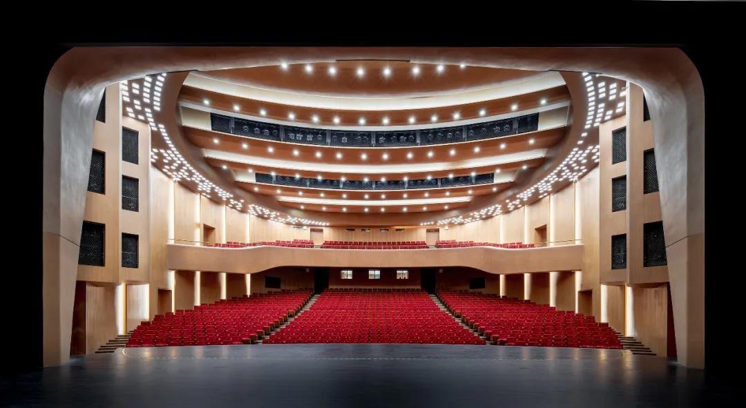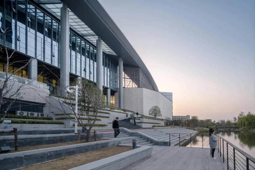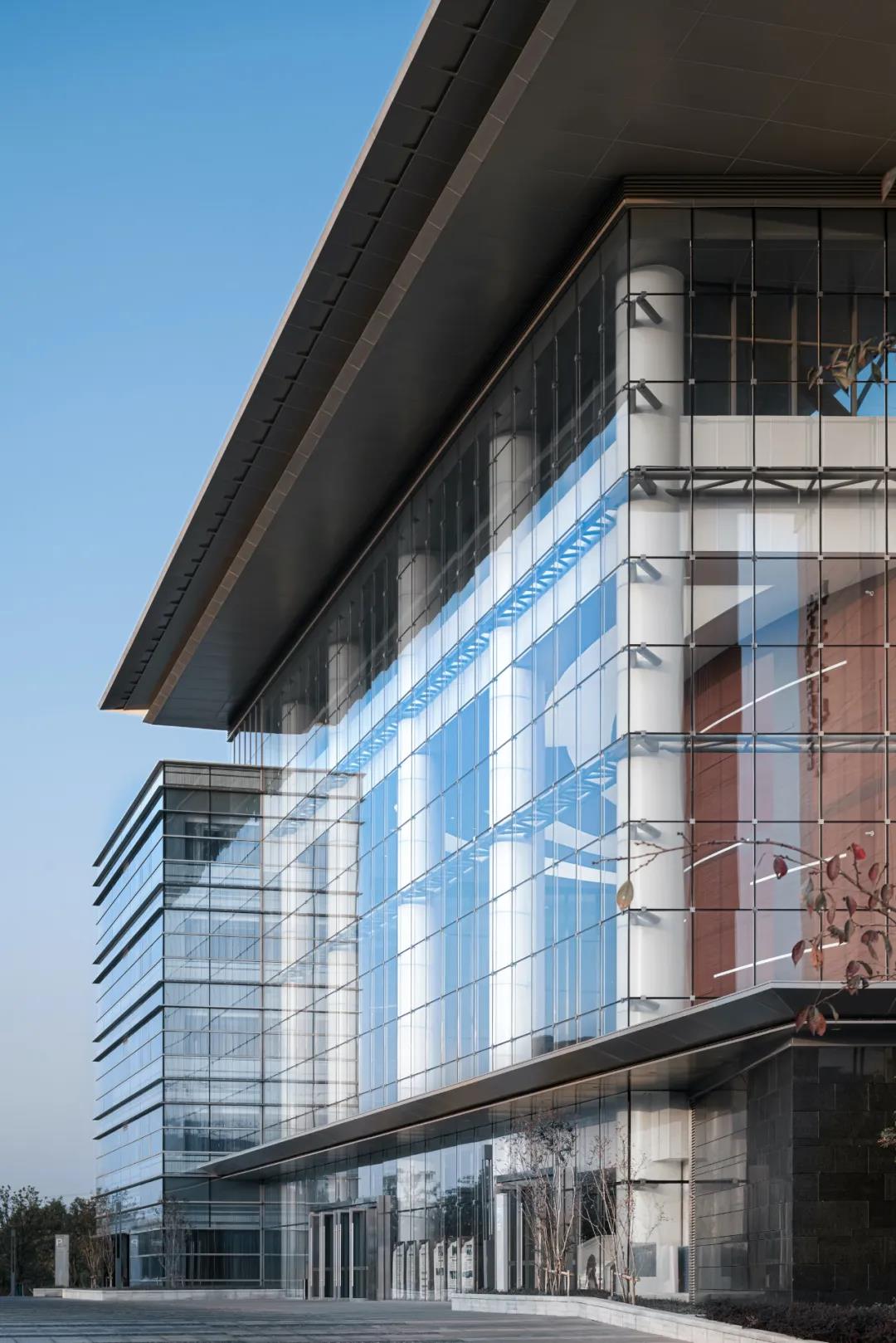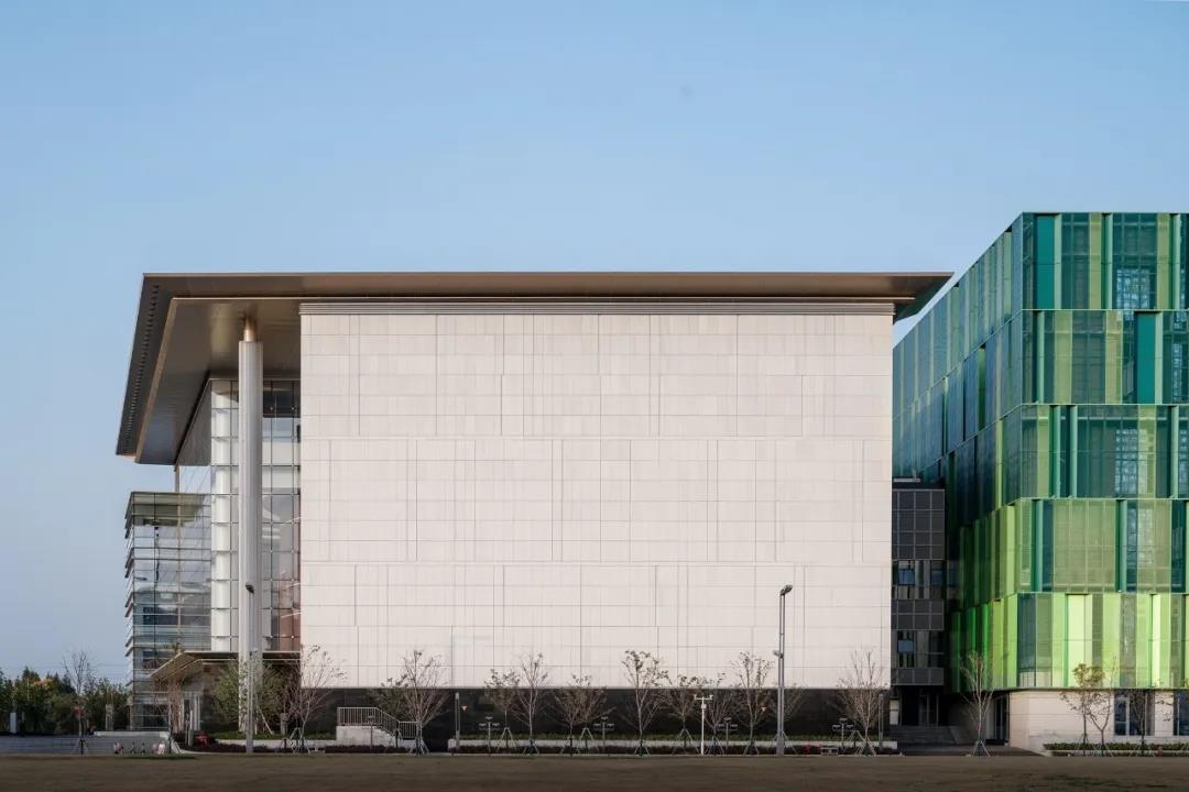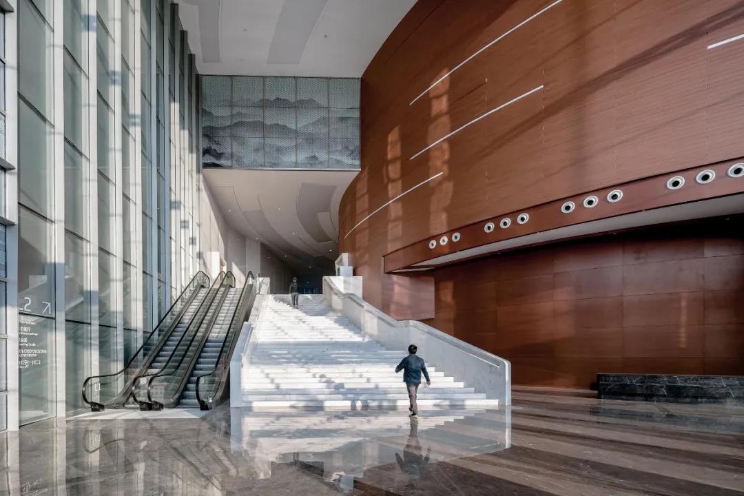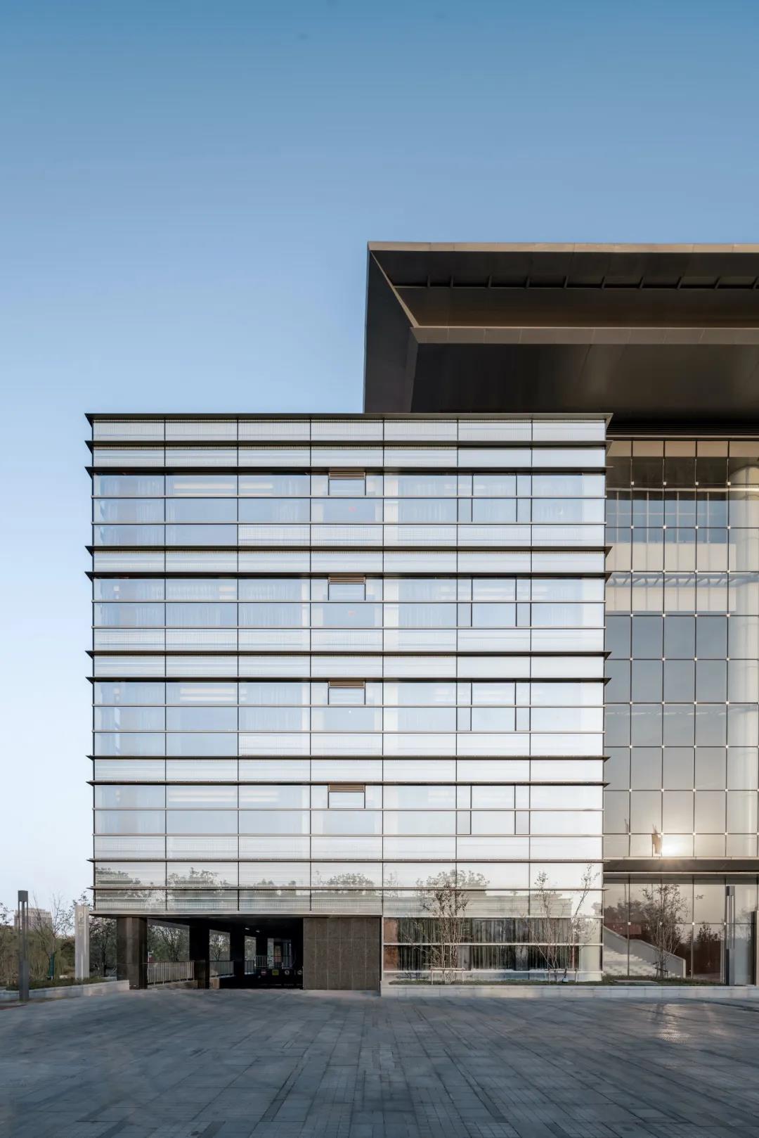 西廣場是文化廣場,包括一個綜合性的演藝會議中心,核心功能是1200座的大劇院,同時承接著地方政府各類會議的任務。廣場占地約3000平方米,景觀層次豐富,視線敞朗,滿足大型文藝觀演的集散要求。立面法度嚴謹,線條平直優雅,門廊高敞,布局端莊。飾面主材選用暖灰色的萊姆石,色彩沉著,肌理柔和,襯以精致的拉鎖玻璃幕墻,塑造了具有儀式感的空間序列,共同形成了安靜內斂的文化氛圍。