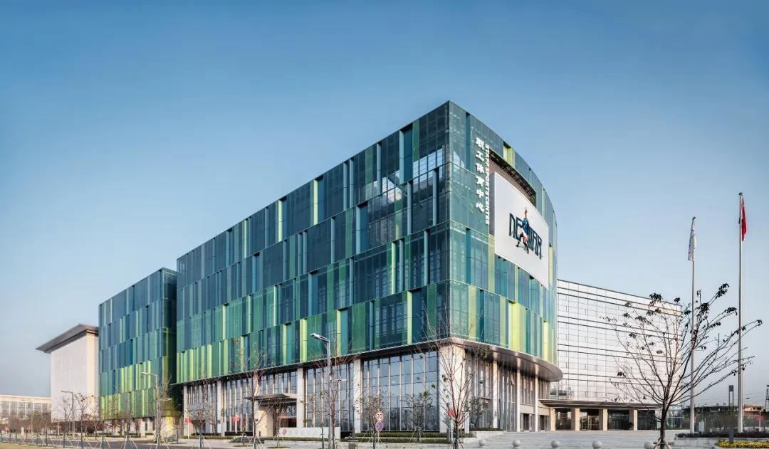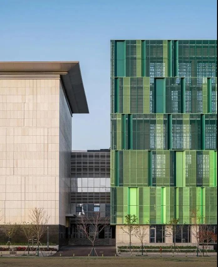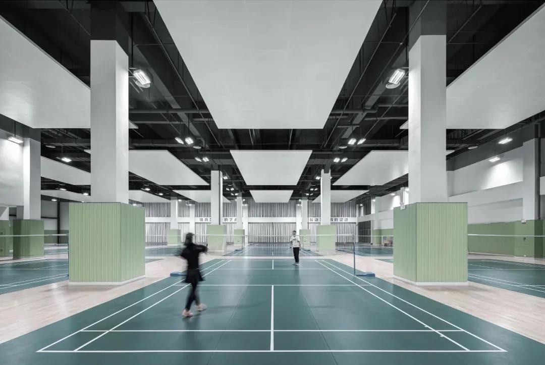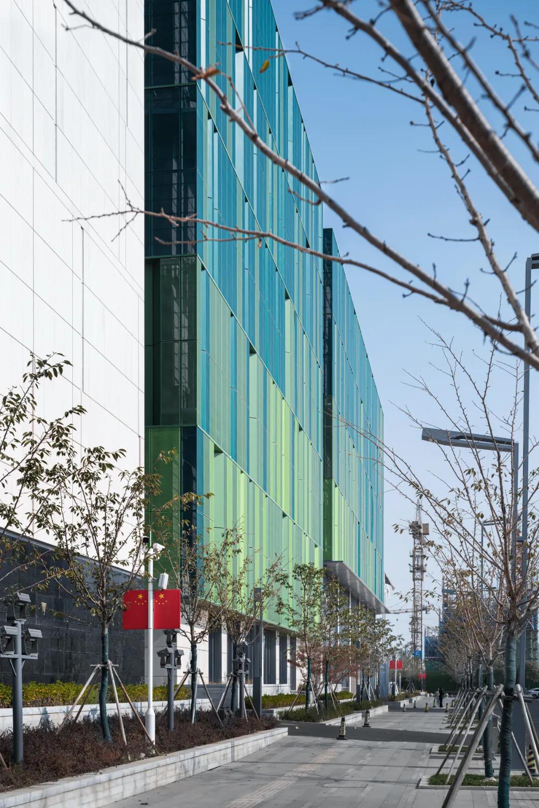 形體對比強烈,直面與弧線,金屬銳度和光滑玻璃,渲染著體育的沖擊力和力量感。其中,綠色是一個具有標簽性的色彩,喻示著生命與自然,傳遞著時尚健康的氣息。主材選用打孔鋁板獲得透明感,運用三種不同深度的綠色,藍綠、中綠和草綠,整體色調上深下淺,色塊間次有機排布;局部單元飾以鋁板實面,或是斜鍥,或是凹入,獲得斑駁的楔狀陰影。陽光穿過幕墻的孔隙,各種綠色相互疊加,仿佛早春晨間的樹林,透明朦朧而生機盎然, 這一特征性的表皮肌理,很好的詮釋了空間場景的主題——運動和活力。