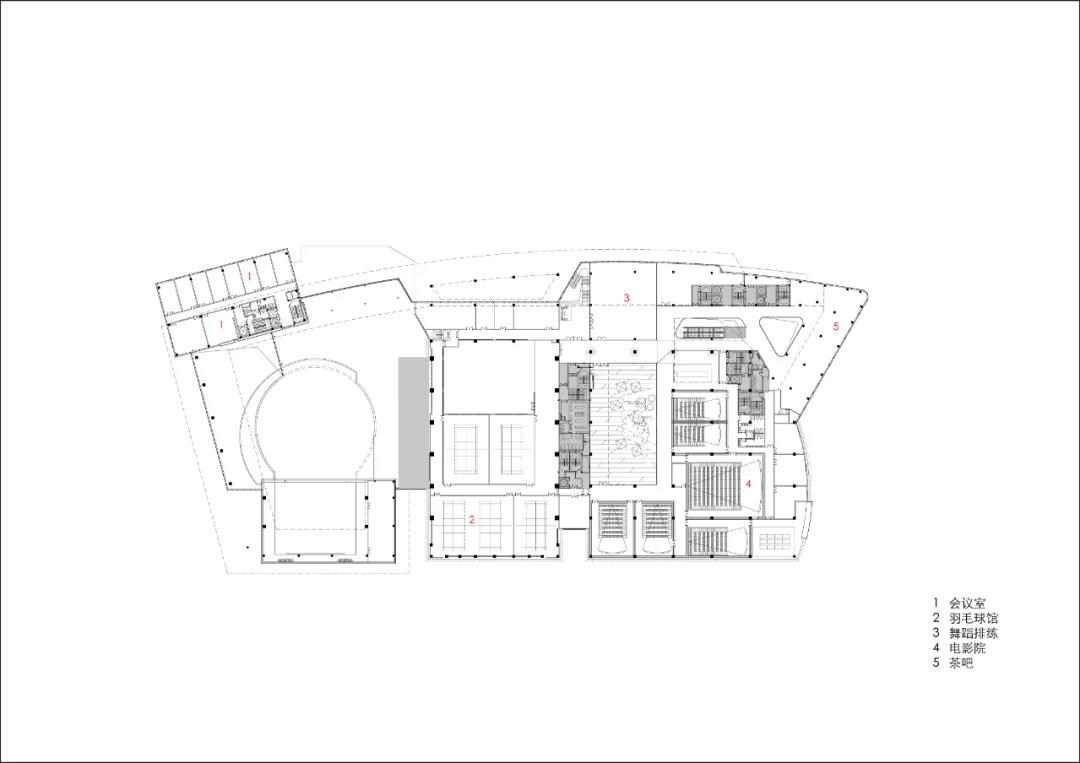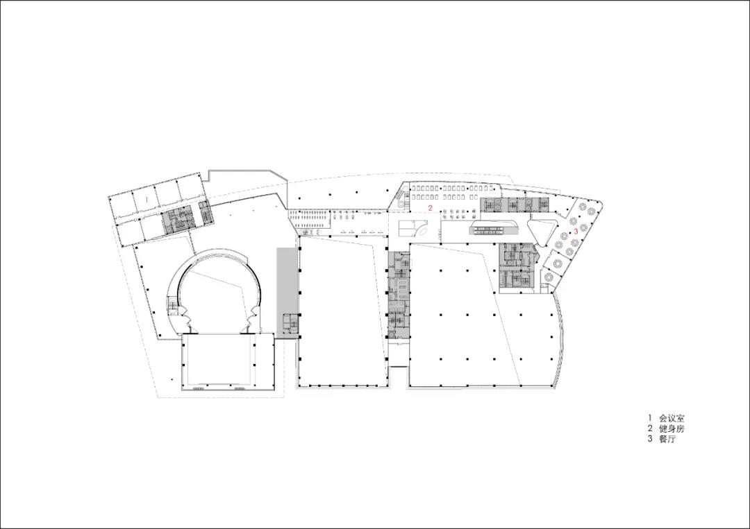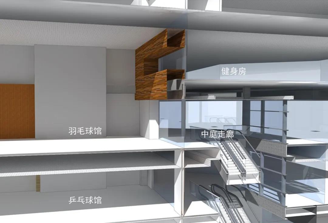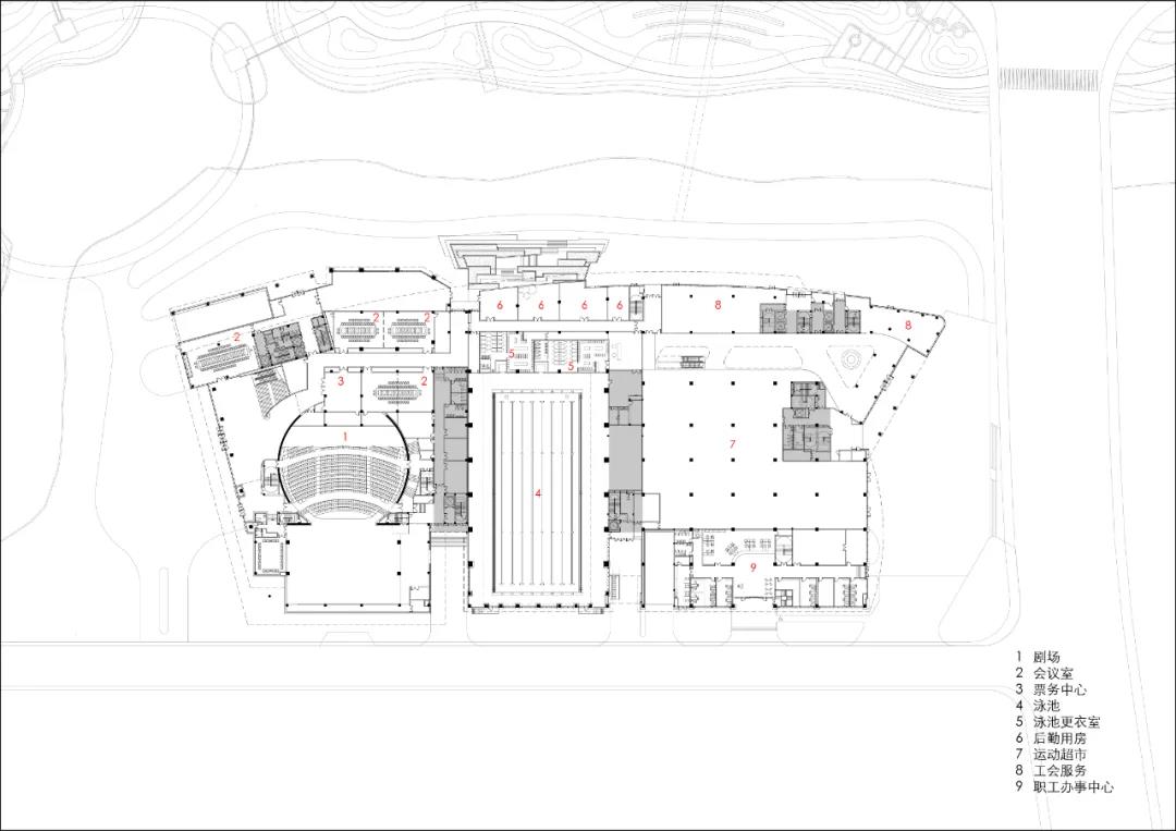 職工文體中心是一個非常集約的綜合體。在極其緊張的用地條件下,每個功能單元,無論劇院、球場還是泳池,都是體積巨大,幾無騰挪余地;各種業態消防要求不一,后勤、貨運路線復雜。服務核是一個有效的模式,將貨運、機電、消防集中在三個核心筒,集成高效,同時保持了前場的靈活性。