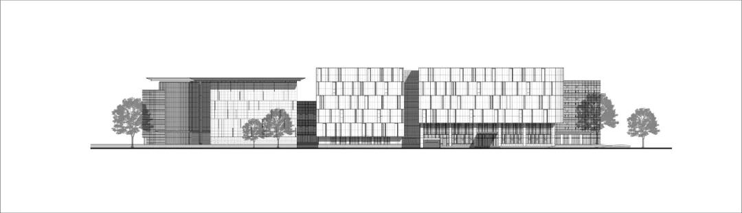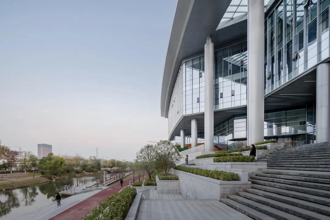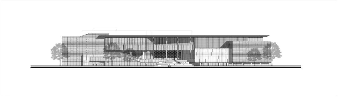 東廣場是體育廣場,包括游泳、籃球、舞蹈等多種類型的體育場館,主要服務于城北新區的居民。不同于西廣場端莊優雅的儀式感,這邊強調的是大眾健身的日常性與運動感。相應的,建筑呈現出另外一種姿態,立面表情變的活潑靈動,透明輕盈。