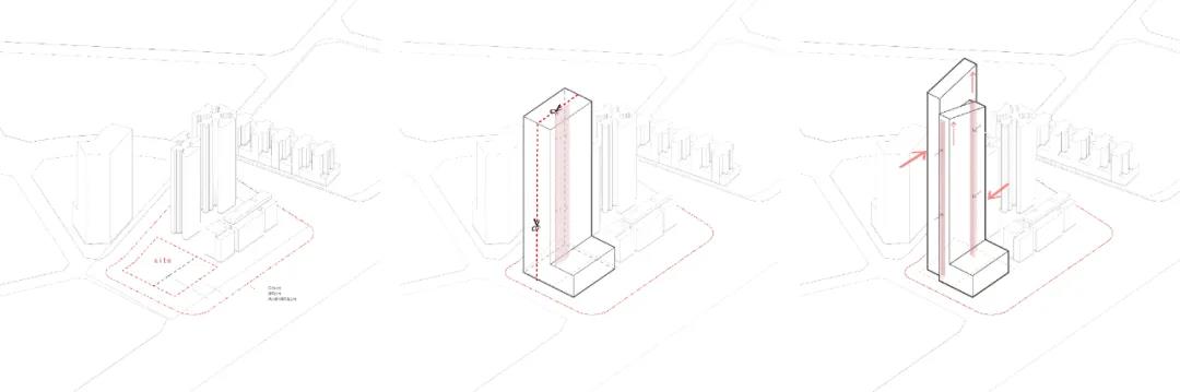 主創建筑師以揚帆起航的畫面為概念靈感,希望用凝固的建筑去描述這種動態的趨勢,以更親近的尺度拉近市民與社區、自然的距離,使之成為融入城市的場所。形態的生成以建筑核心筒為軸心,向南北分成兩個體塊,東西錯開一個柱跨。