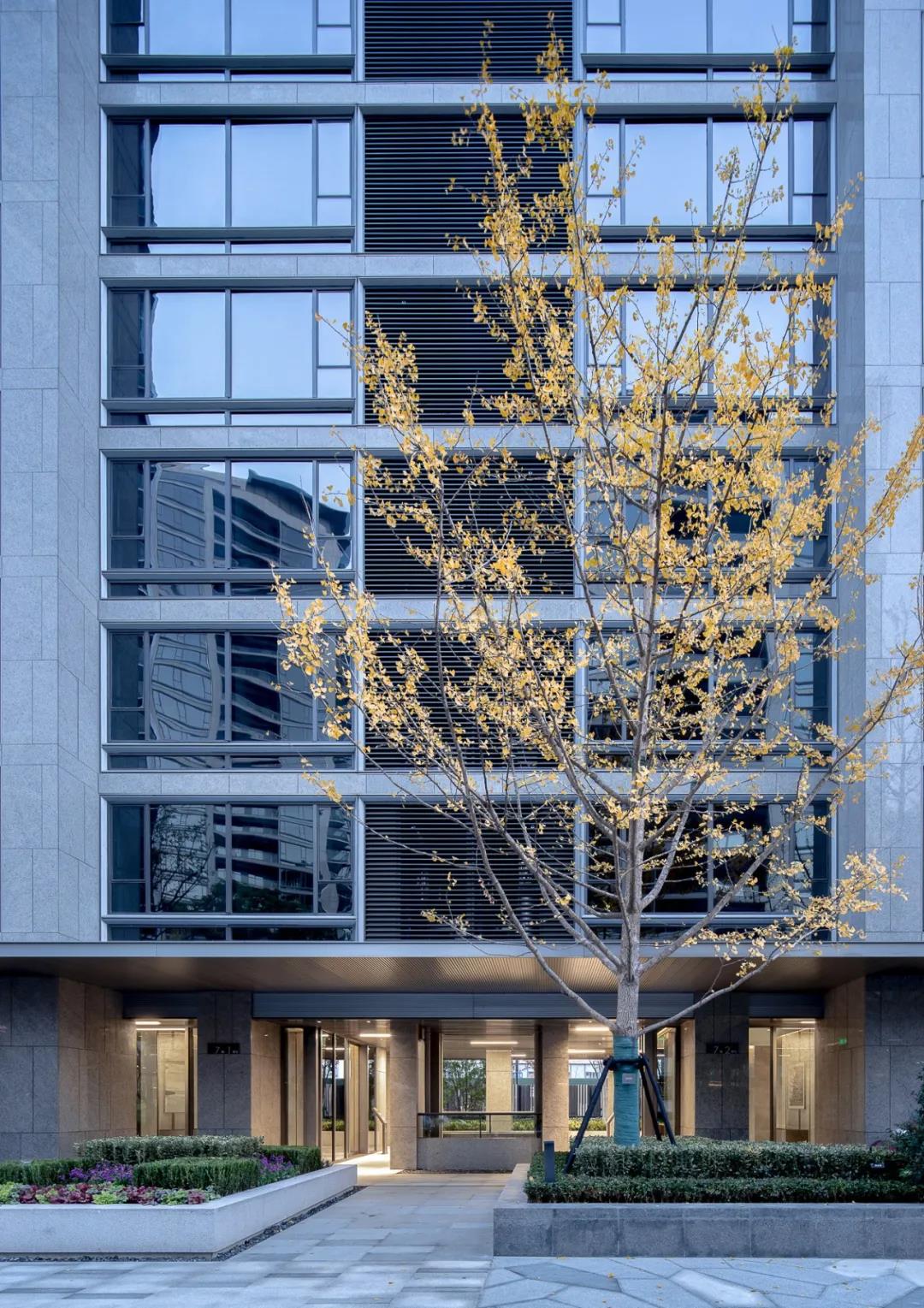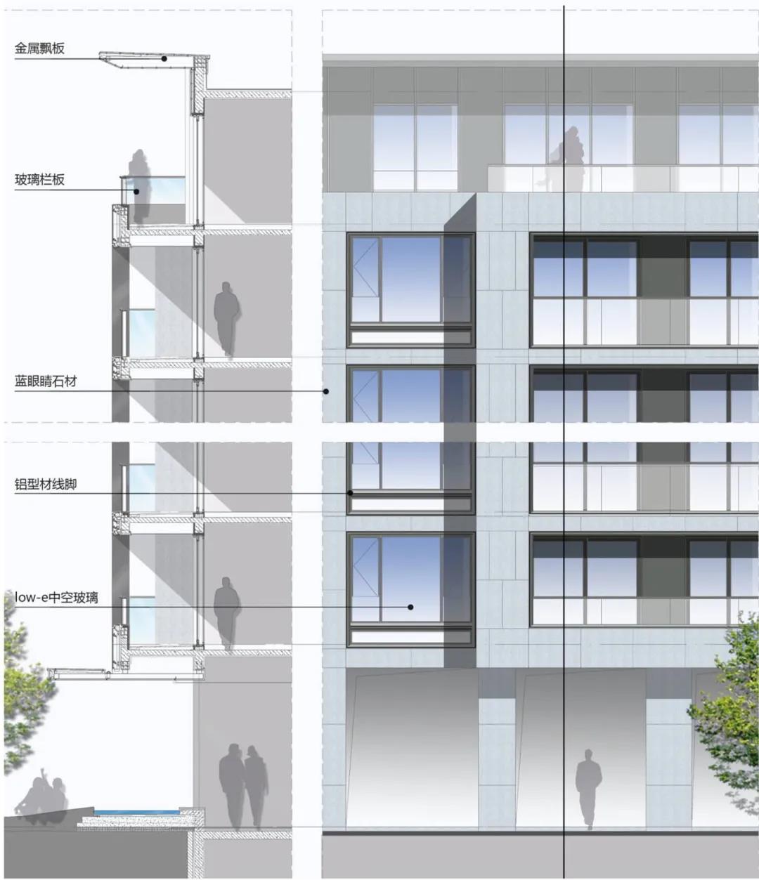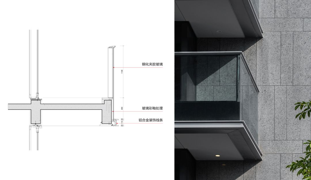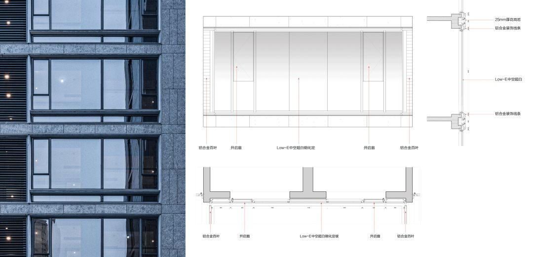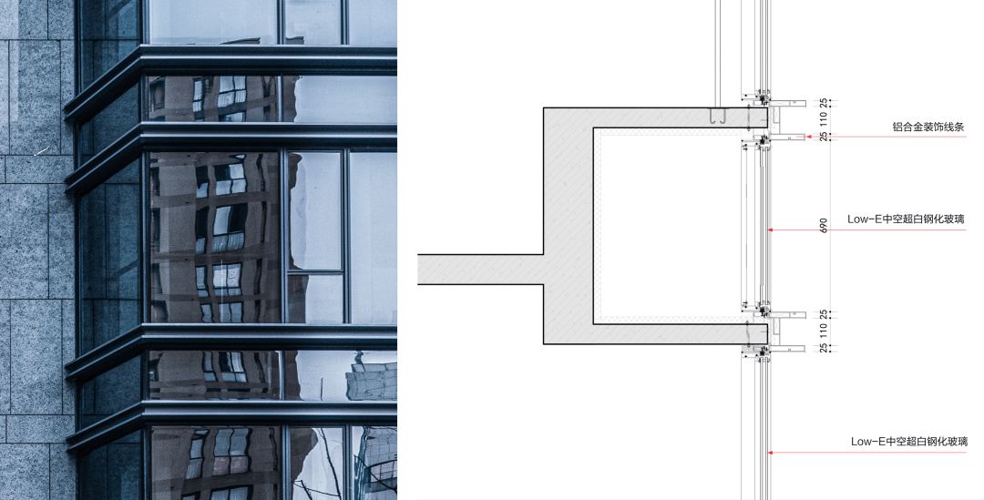 暖灰色的石材,以兩個不同的模數,進行錯縫劃分,豎向拼接,強化垂直感。金屬型材顏色,也做了兩種色彩區分。立面實虛交界處型材框都選用亮銀色噴涂,玻璃劃分立挺保持與玻璃一致,選用深灰色噴涂,這樣形成兩個立面層次,強化了洞口邊界的精致度。