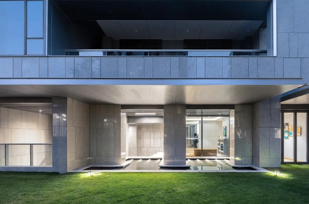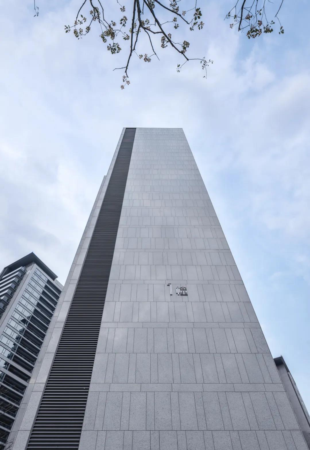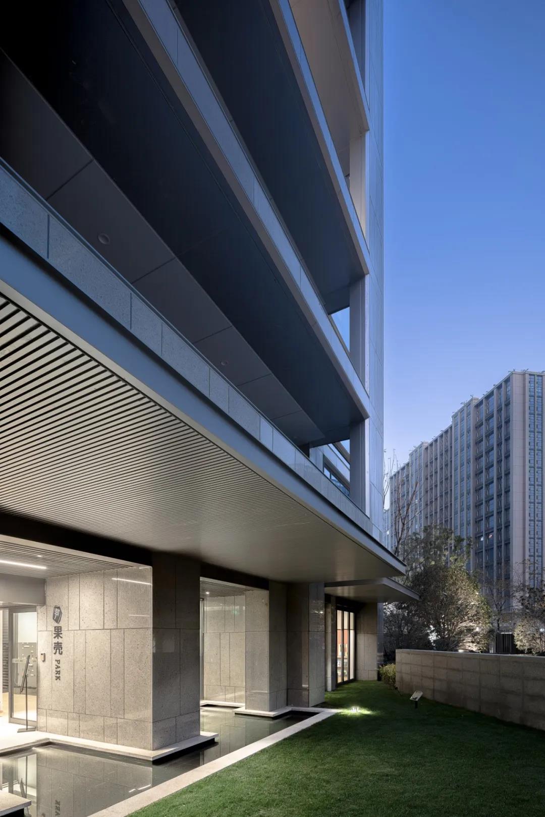 暖灰色的石材,以兩個不同的模數,進行錯縫劃分,豎向拼接,強化垂直感。金屬型材顏色,也做了兩種色彩區分。立面實虛交界處型材框都選用亮銀色噴涂,玻璃劃分立挺保持與玻璃一致,選用深灰色噴涂,這樣形成兩個立面層次,強化了洞口邊界的精致度。