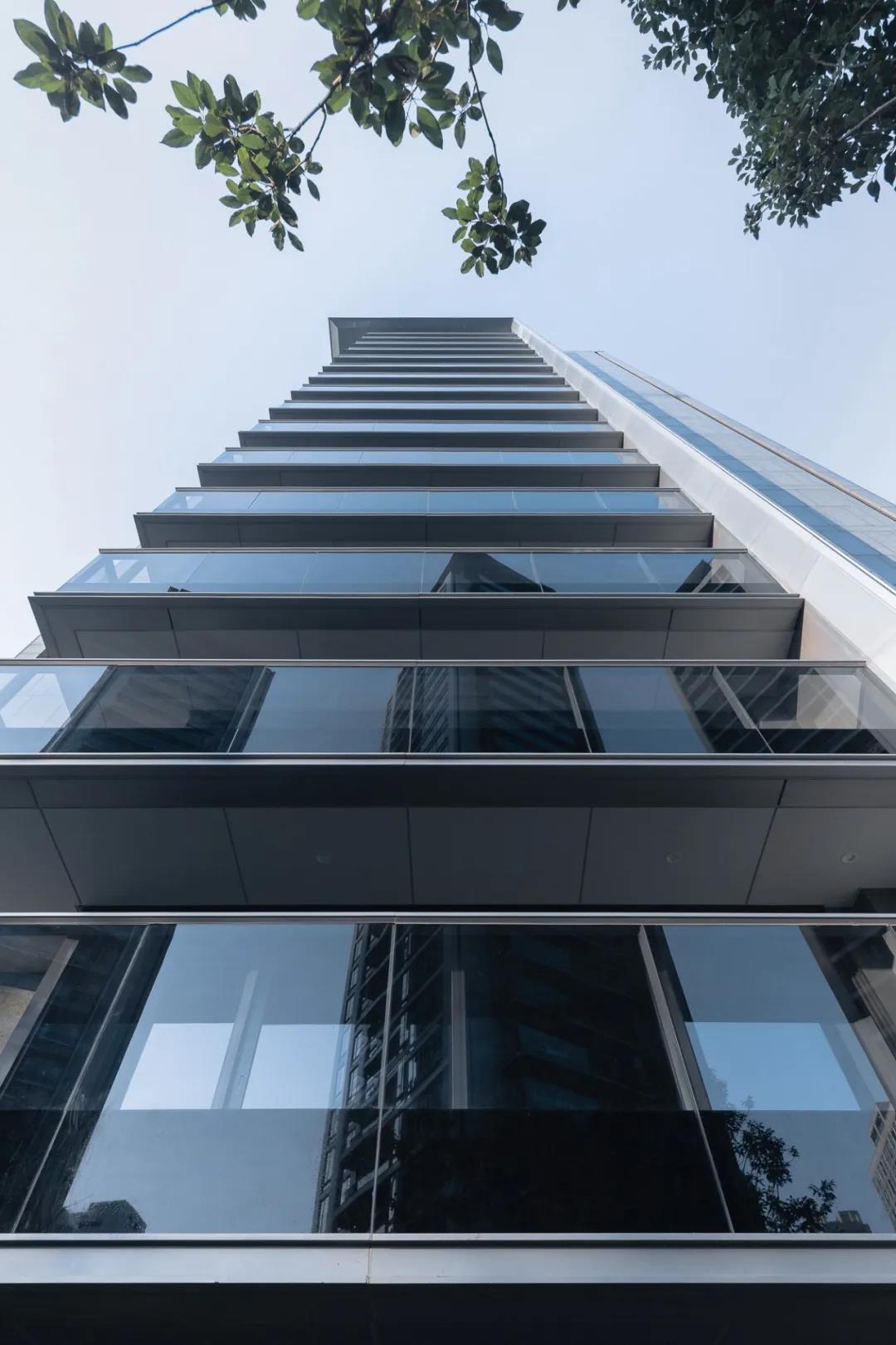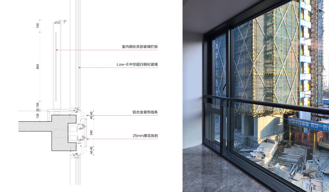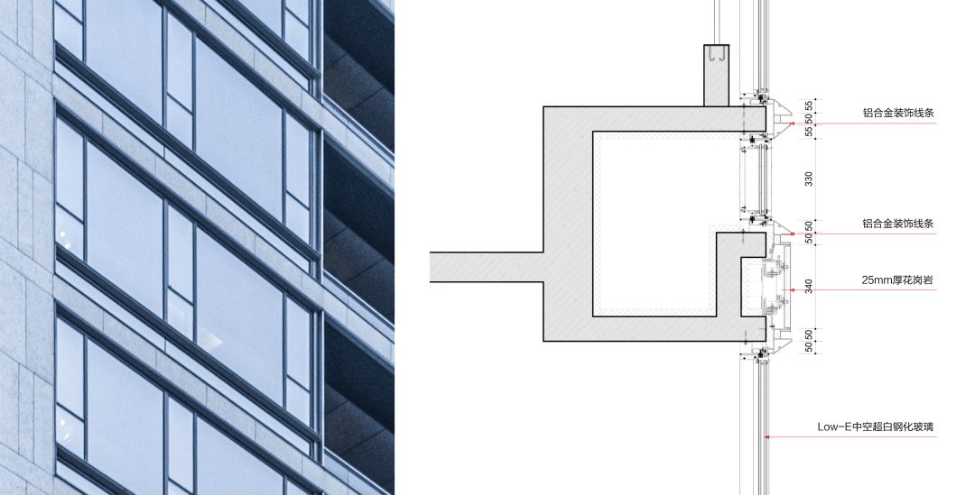 當地設計規范規定,住宅立面不允許使用幕墻系統。為此,我們與幕墻單位共同研發了一種類幕墻的窗體系,通俗地說,就是在土建結構上受力,外立面實現輕盈的連續玻璃幕墻效果,再根據不同的位置設計相應的構造節點。