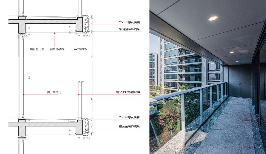 陽臺外墻柱內凸,優化結構截面,結合室內窗簾盒的設置,保證陽臺的連續性。增設門套,避免陽臺涂料面的陽角轉角。設計時控制陽臺挑梁高度,保證陽臺吊頂完成面和陽臺門框等高。為了強化轉角側向大陽臺的玻璃體積感,將玻璃欄板下沿到混凝土梁外側,欄板采用******方式固定,并做局部釉面處理,遮擋混凝土截面。