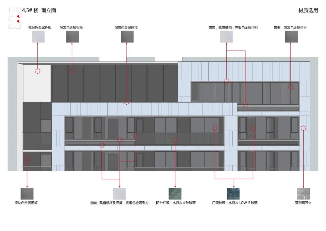 L型不對稱的輪廓平面對建筑的立面設計提出了挑戰,無論是橫線條、豎線條或立面軸線對稱法則都無法匹配現有戶型形體關系。