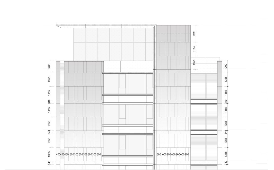 因此,我們提出以片墻“面”的形式語言來化解凹凸不平的體量關系。自由、非對稱的立面樣式回應了非對稱、不規整的平面,平面和立面語言邏輯的一致性得到了保證。