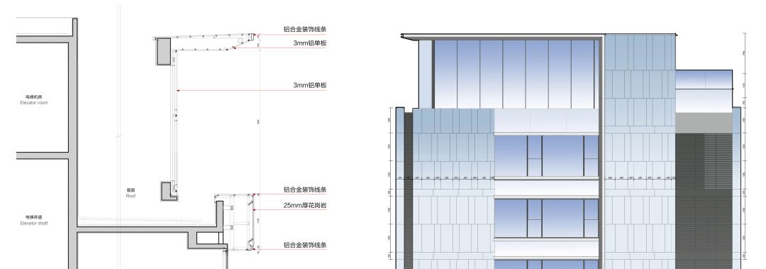 在不突破限高的基礎上,通過頂層設置構架,以折板的語言將外立面幕墻延伸到設備層,將電梯機房隱藏到了立面的背后。