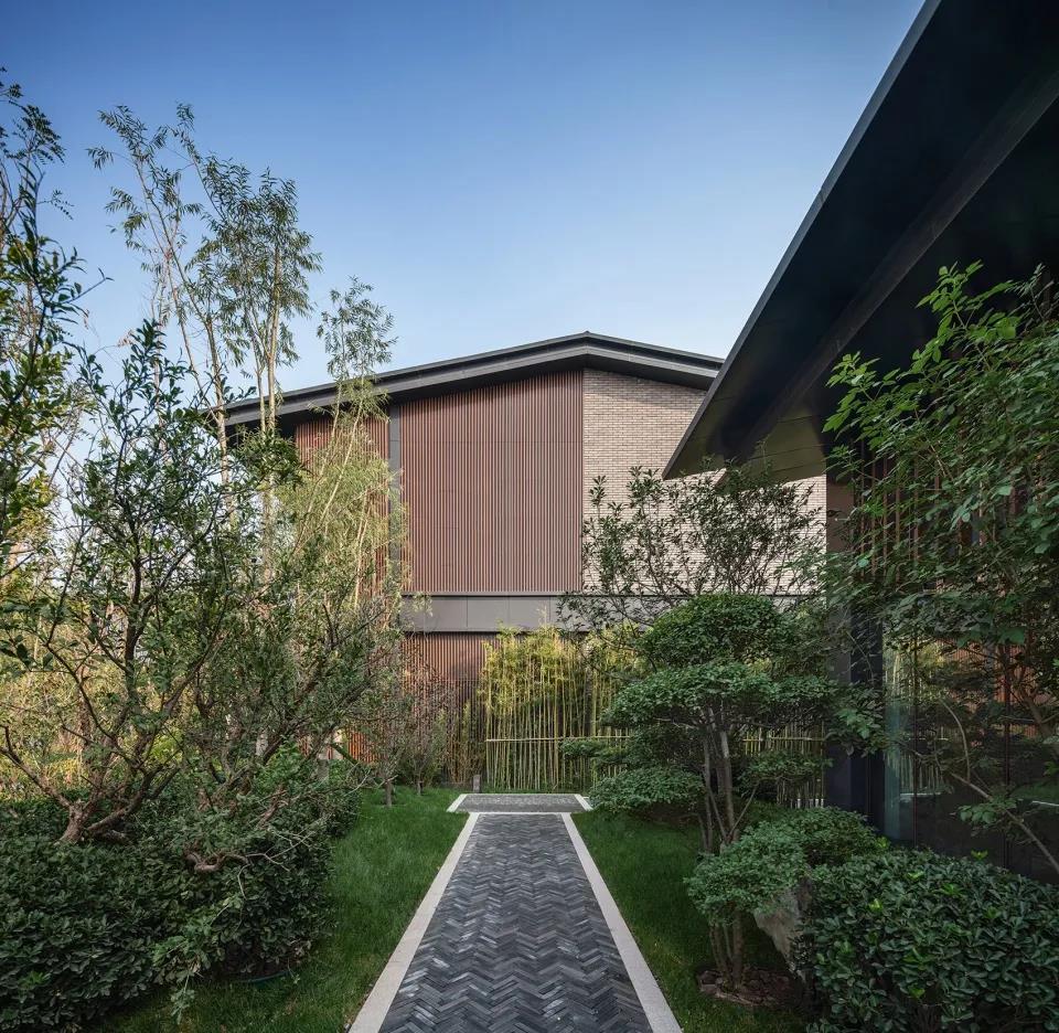 度假風的別墅體現了中國傳統庭院的現代詮釋。線條修長利落的雙層別墅群面向中央花園,并沿地塊周邊園林布置。別墅群平移錯落的排列,形成自成一角的私密空間,讓訪客盡情享受及放松。同時,別墅之間以流暢有序的庭院花園及有蓋行人道連接,將戶外自然環境與室內空間無縫連接,提供舒適開放的空間,讓訪客輕松游走恬靜的私人空間和共享小區。傾斜的屋頂及標志性的梁柱呼應傳統設計,突顯統一的整體建筑設計,更與當地小區建立密不可分的聯系。