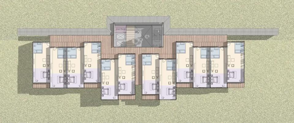 受古城啟發,酒店的總體規劃以南北為導向,兩座中層酒店大樓與六十座別墅沿中心軸線垂直布局。兩座酒店大樓置于總體規劃的北部,共提供二百間客房,并采用了單邊式走廊,飽覽優美河景。傳統建筑元素經重新演繹,遍布酒店內外,由外立面至客房內部皆貫徹統一。