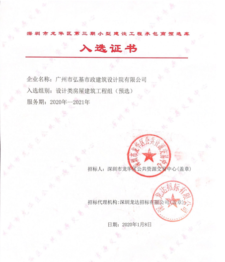 此次成功入選,標志著廣州市弘基市政建筑設計院有限公司進入了深圳市龍華區小型建設工程承包商預選庫的第一方陣,充分體現了公司的綜合實力,對公司業務的開展起到了積極的助推作用,進一步提高了公司的市場競爭力。