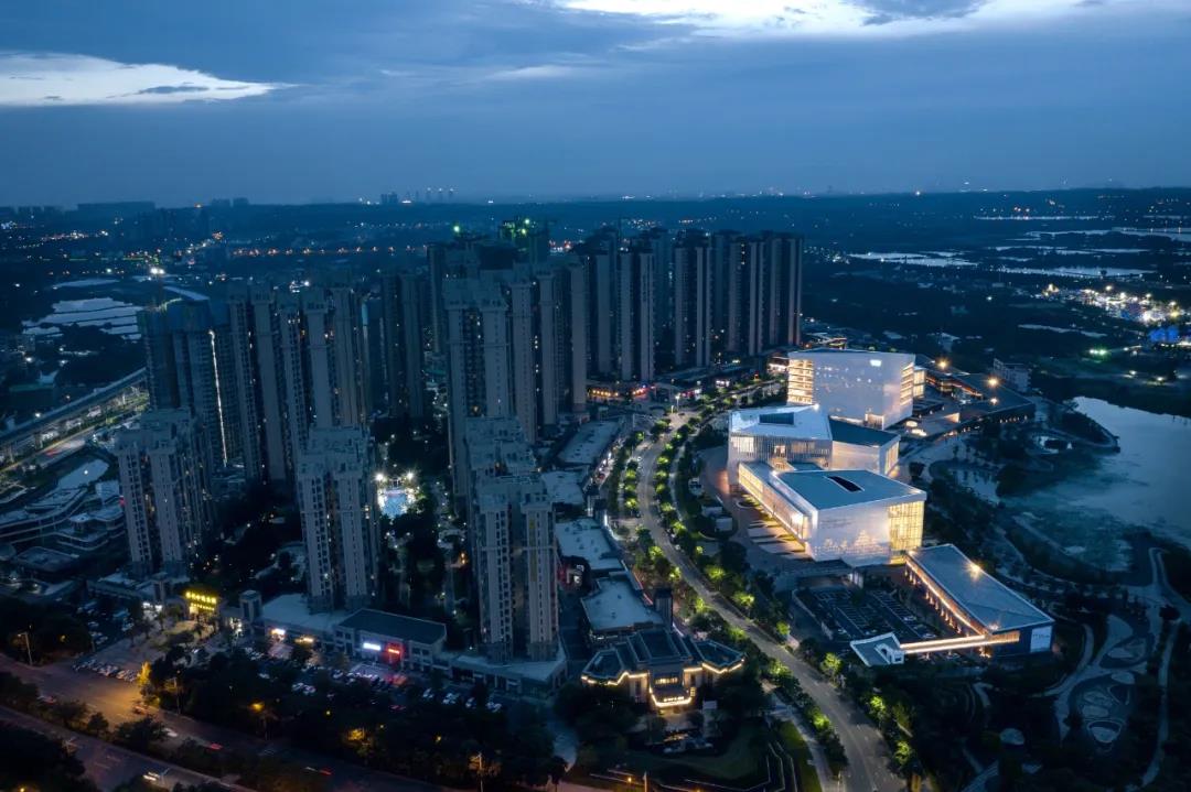?夜,內藏于孔板后的燈光系統將因應相應的展示模式亮起,針對不同的節?慶典場合作出相應的變化效果。建筑在燈光下,??上的??畫卷形成反向版畫效果,倒影于?庭,成為了三?新城?道亮麗的?景,成為新城特?的?化名?。