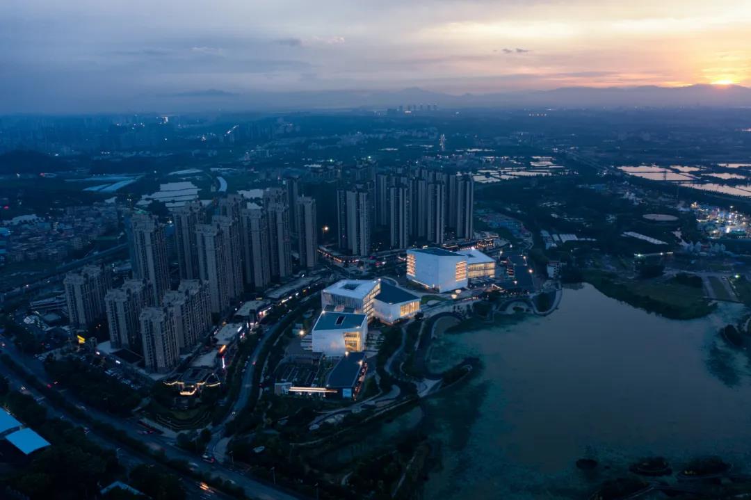 三?,因?江、北江、綏江三江在境內匯流?得名。它的??綠?讓?過?不忘,三?新城以?、?、島、城、洲的規劃理念更讓?為之向往。三?新城?化商業中?五棟建筑的????副完整的?墨??畫綿延串聯,既分亦合,遠看建筑群跌宕完整,近觀每棟單體建筑?又通過彩色絲網印幕墻(不同場館具備不同的主題色,圖書館-綠;檔案館與城建展覽館-藍;文化活動中心-紅;科技館-黃)展示?式增加場館的可識性;各場館各具特?易于分辨。