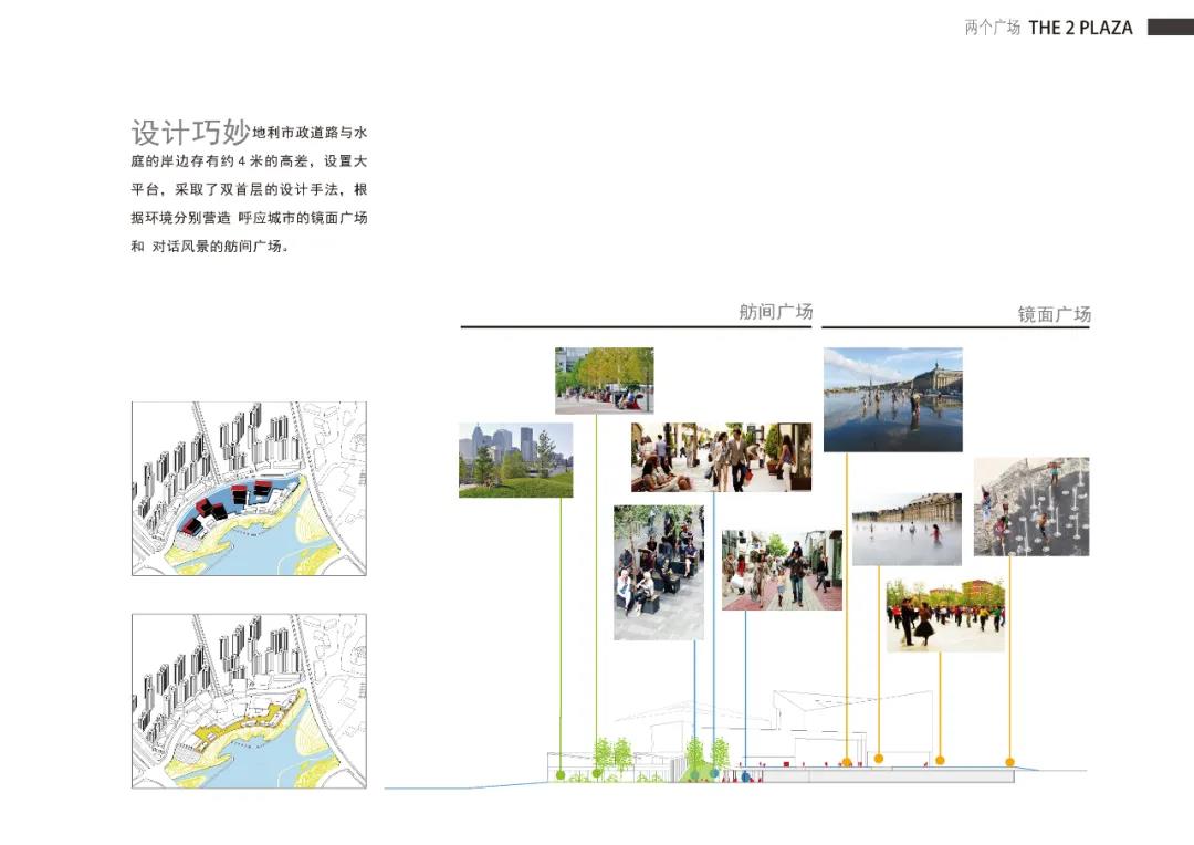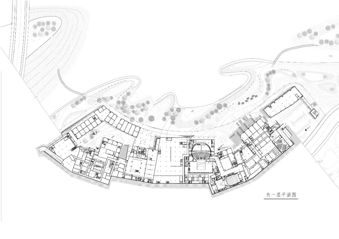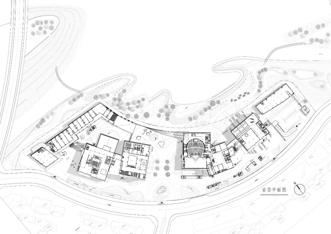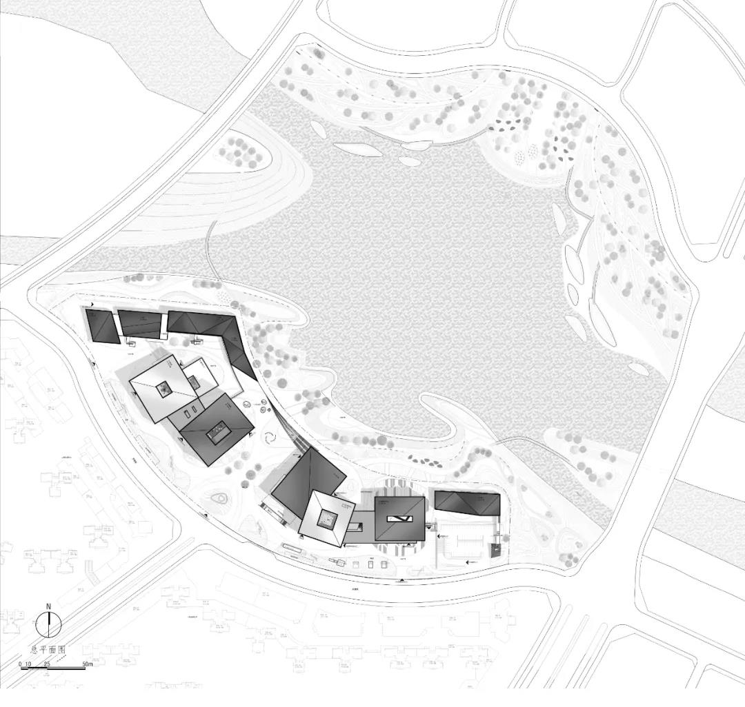 ?地位于新城的綠軸之上,最?限度地將開放空間反饋給城市是我們的出發點,除了將?身的場地共享予市?,還將其作為城市與?庭公園間關鍵的紐帶,市?能?分便捷地漫游和停留其中,或到?庭公園踏?尋荷,或在半開放臺階?場上駐?遠眺。我們利?地形?差分別設置了節慶?場(?向城市)和舫間?場(聯系?然)。城市與?庭透過?化商業中?互相滲透,?然漫?都市,相互交融。