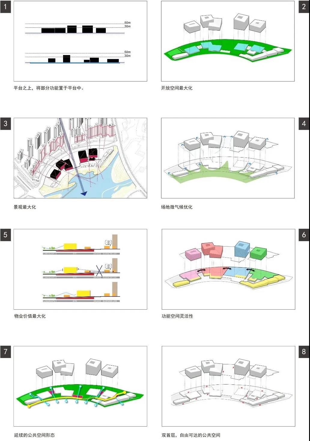 超級地表則成為了節慶?場,市?從城市界??常容易到達。避免了巨構建筑對?庭的獨占性,余下的建筑體量被打碎按照功能分區組團布置,成為坊城。場館間構筑成為坊間的空間場所,景觀能透過適宜體量的建筑漫?城市,?們也有多種多樣的路徑可以穿越?化商業中?到達?庭。同時,得益于?庭荷岸的濕潤,坊成為了舫。