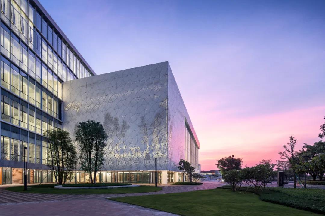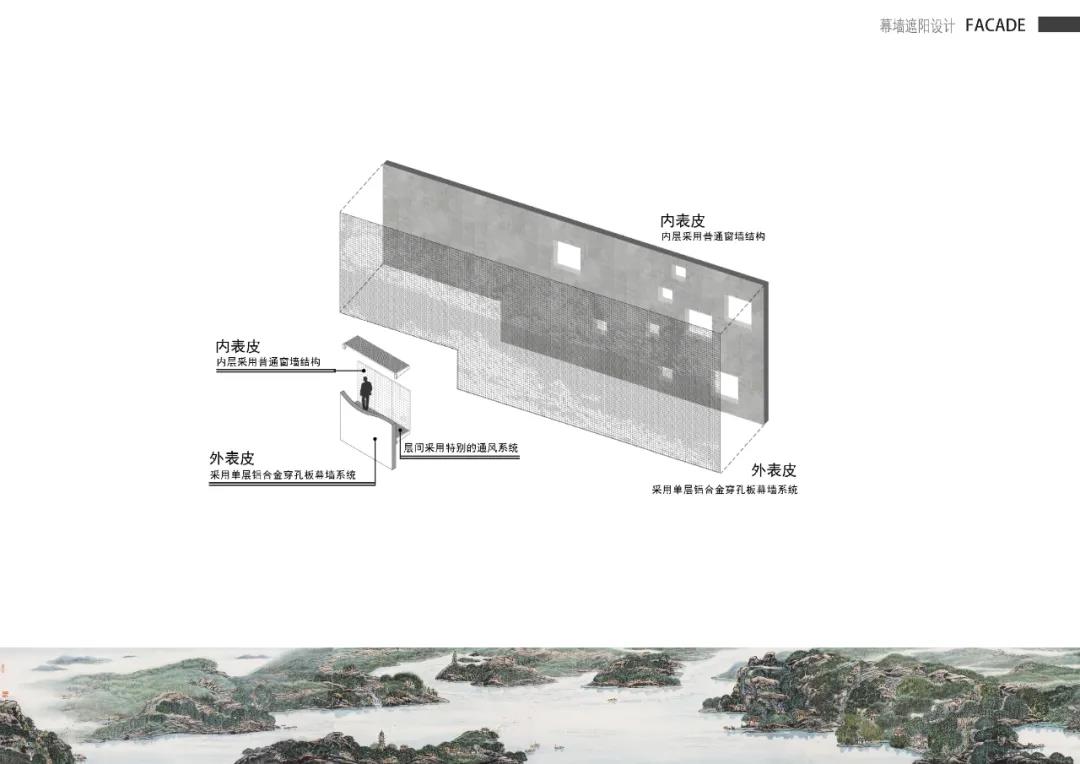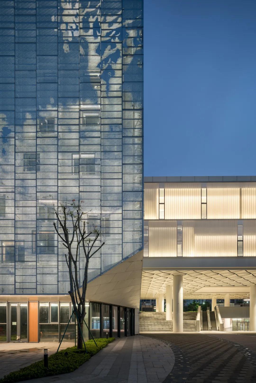 同時,?墨畫通過參數化的圓洞尺?和密度呈現,為了更加真實的模擬呈現宣紙的肌理,建筑師還特意跟幕墻設計師共同實踐,創新性的把?屬板材做了捶打效果,增加建筑表?光線的漫反射,減弱?屬本身的強烈?反光。?天這幅?體的?墨??畫卷清晰可辨。