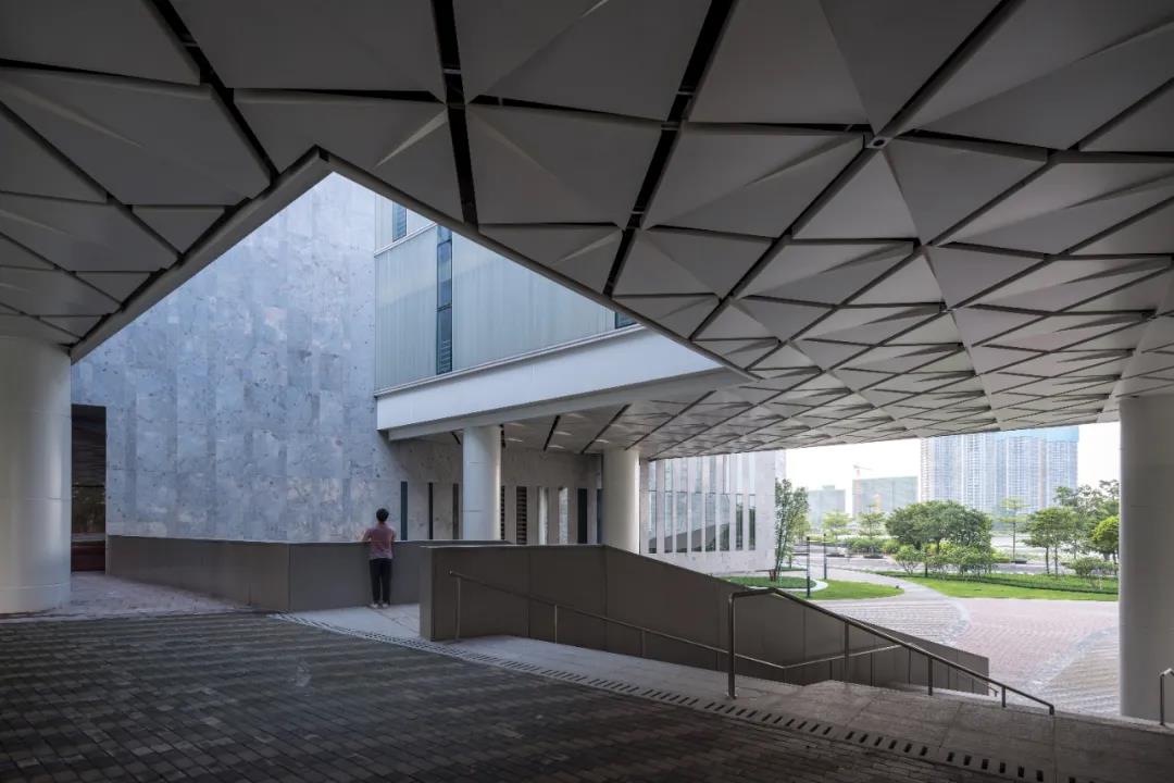 在尺度的層級,我們有效地控制了地?建筑體量,更多地留出地?公共空間,架空通廊在贈予蔭涼的同時保證城市?廊的延續。在造型把握上,則?圖采?現代的?段詮釋嶺南建筑的神髓,并結合可持續策略中的被動式建筑原理設置遮陽??及天井式內庭院。