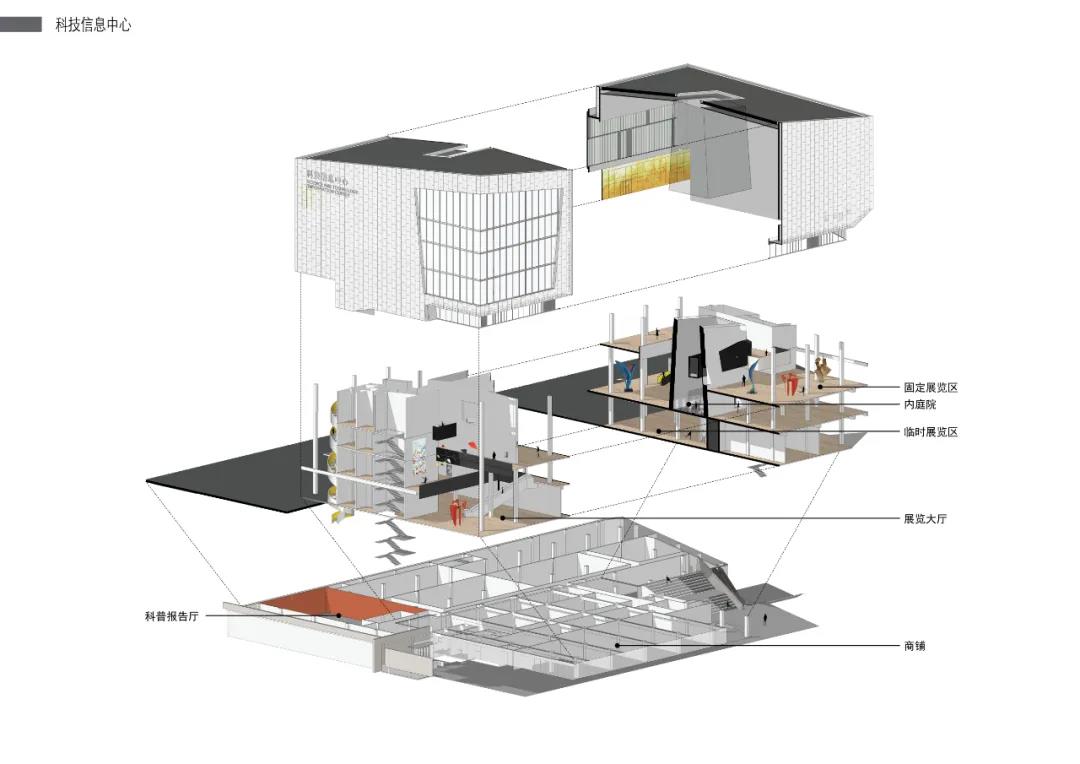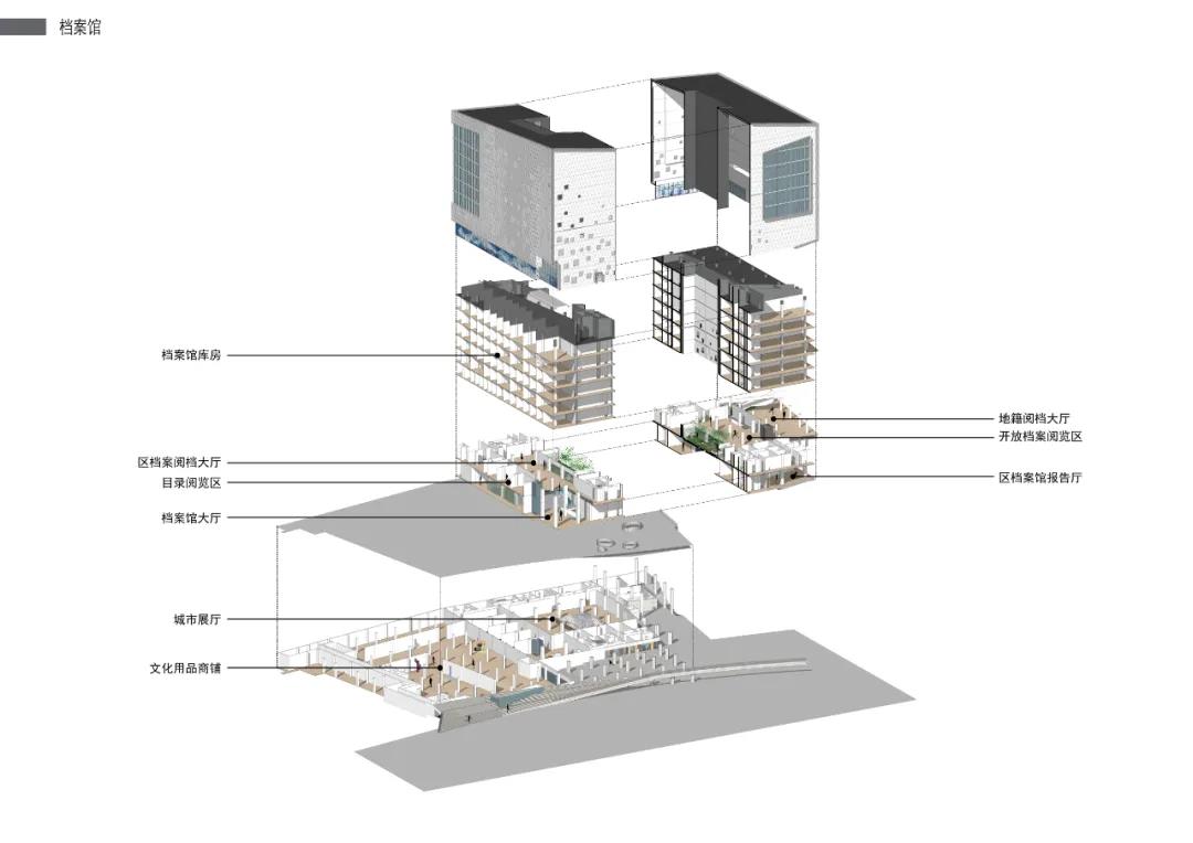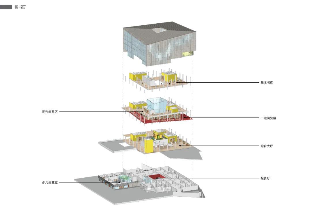 三?原有的城市機理是宜?的,街坊式的城市格局,鮮有巨構的體量。?化商業中?利?城市?道與湖岸的4??差,設置了?個適當抬起1.5?的“超級地表”。將?部分建筑體量置于其下,形成“超級地表”之下的公共空間;其中,包含展覽空間、報告廳、藝術商店、?童閱覽、樂器?具店、書店咖啡等,并且上述設施均有開向舫間?場的對外出??。